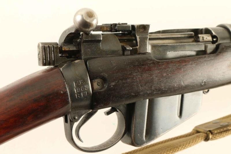 SN: 09302 WWII era British military magazine fed bolt action service rifle chambered in .303 British, refurbished & remarked by R.F.I. in 1963. Features a blued finish, 25.2" barrel with integral bayonet lugs, shrouded patridge front sight, stamped metal flip-up aperture rear sight graduated to 1300 meters, two barrel bands, smooth trigger, detachable 10 round magazine, manual safety on the left side of the receiver, tan canvas sling, integral charge loading guide cuts in the receiver, smooth full-length wood handguard & forend and straight grip shoulder stock with metal trapdoor buttplate. The left side of the receiver is stamped "NO4 MK1" and the right side of the butt socket is marked "F.R./1963/R.F.I." Serial numbers match on the receiver, bolt handle and forend. Rifle exhibits approximately 80% of it's blued finish showing wear and dried grease. Action is smooth, the two land bore is pristine and the wood stocks are very good. Condition is NRA Very Good. ***C&R Firearm*** From The John F Sukey Collection