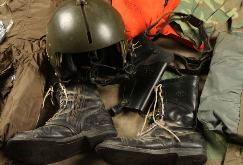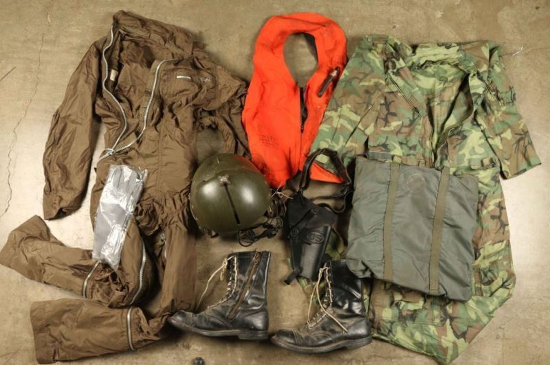 Circa 1965 including; ODU green helmet with protective bag, 'US' marked leather holster, leather gloves, G-suit, flight suit, fabric and leather gloves, and a 'NAVY' safety vest.