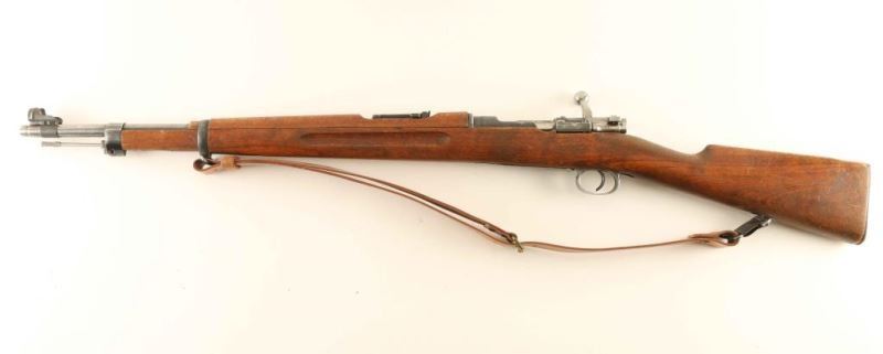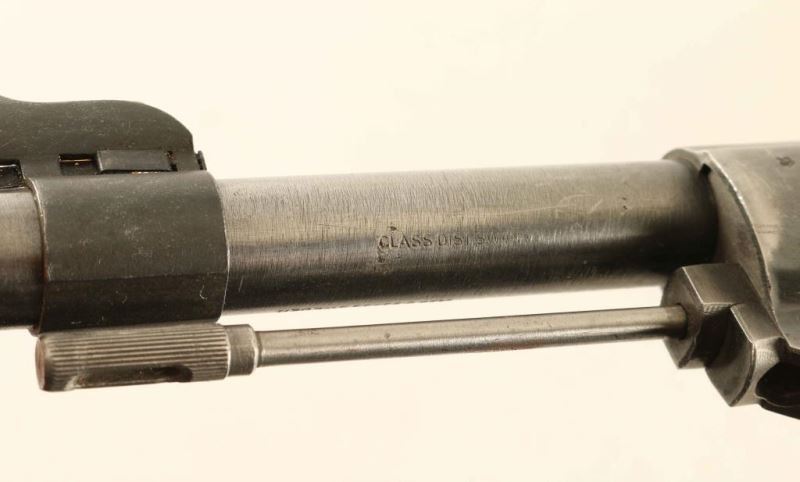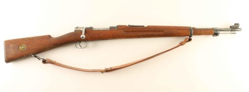 WWII era Swedish military bolt action mauser rifle chambered in 6.5x55mm Swedish, manufactured circa 1942. Imported by Classic Distributors of Swan, V.T. with import marks on the underside of the barrel. Features a blued finish, 23.5" barrel, hooded patridge front sight, ladder style rear sight graduated to 600 meters, cleaning rod, smooth trigger, internal 5 round box magazine, integral stripper clip guide cuts in the receiver, turned-down bolt handle, three-position manual safety on the bolt, smooth brown leather sling, smooth wood handguard and straight grip shoulder stock with finger grooved forend, brass stock disc & smooth metal buttplate. Serial numbers match on the receiver, bolt knob, cocking piece(electro pencil), bolt sleeve(electro pencil), safety(electro pencil) and buttplate. The stock disk is marked 6.50" bore diameter, #1 bore condition and 0 holdover. Rifle retains approximately 70% of it's blued finish showing thinning and wear. Action is smooth, the bore appears very good but dark and the wood stocks are good. Condition is NRA Good+. ***C&R Firearm*** From The John F Sukey Collection