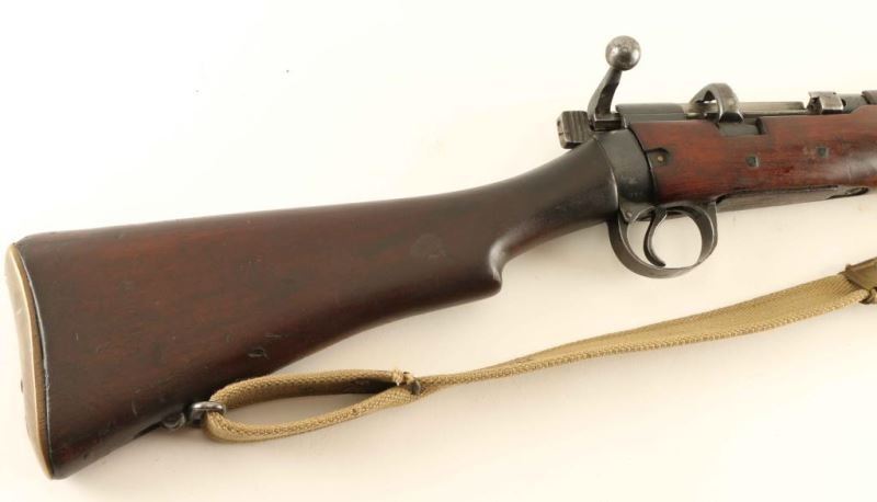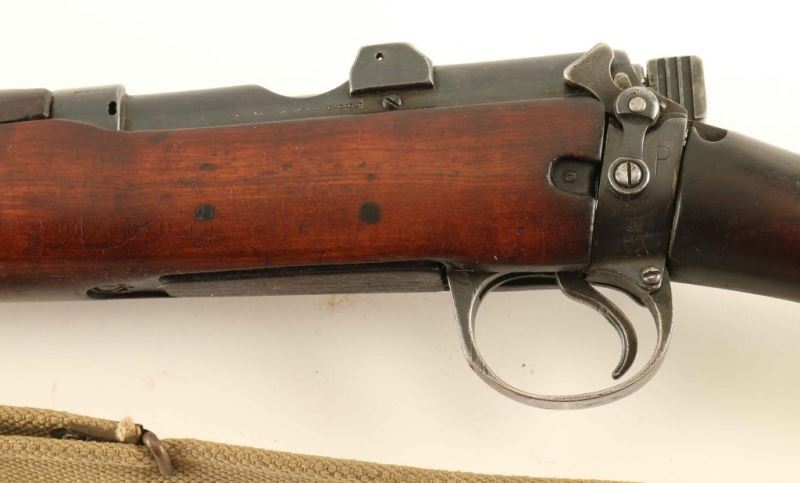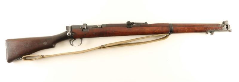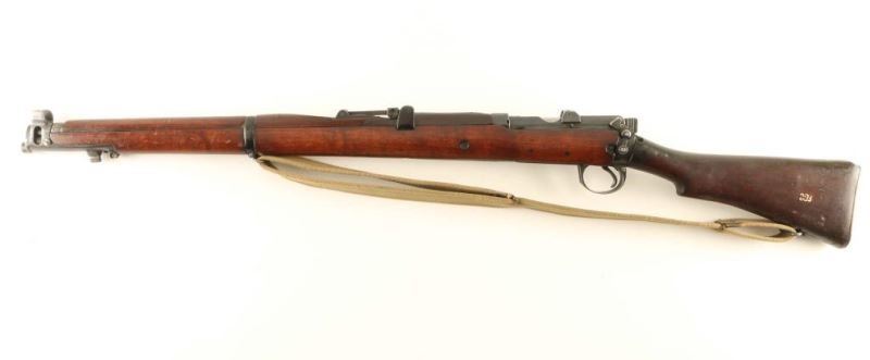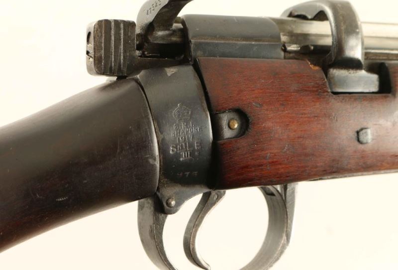 'Single Loader' Indian military single shot bolt action service rifle chambered in .303 British, manufactured circa 1917. Shows import marks on the left side of the receiver. Features a blued finish, 25.2" barrel, raised patridge front sight, shrouded leaf type rear sight graduated to 2,000 yards, metal nosecap with bayonet lug, protective front sight ears, single barrel band, serrated trigger, wood filled magazine well with a metal feeding tray, manual safety on the left side of the receiver, canvas sling, charge loading bridge on the receiver, smooth full-length wood hand guard & forend and straight grip shoulder stock with brass trapdoor buttplate. The right side of the butt socket is marked "[crown]/G.R.I./ISHAPORE/1917/Sht L E/III*/975" and the left side of the butt socket is marked "P" & "SL/RFI/1925." The barrel is stamped "*" over the chamber and the barrel & receiver shows nitro proofs. Serial numbers match on the receiver, barrel, bolt handle, rear sight and nose cap. Rifle exhibits approximately 70% of it's blued finish with higher concentrations of wear on the nose cap and trigger guard. Action is smooth, the bore is good and the wood stocks are good with cracks in the handguard. Condition is NRA Good. ***C&R Firearm*** From The John F Sukey Collection