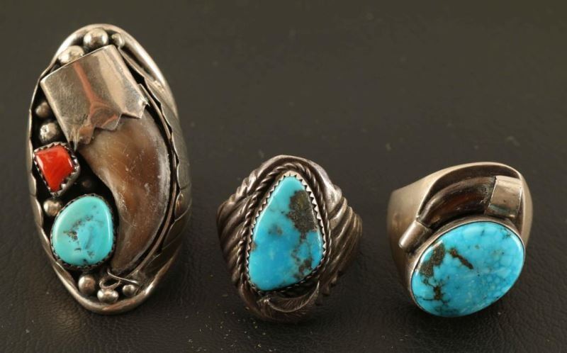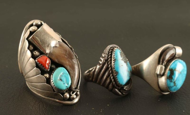 Large ring with bear claw, turquoise and coral stone with bead design, small bear claw and oval turquoise stone ring, and a triangular turquoise stone with rope and feather design.