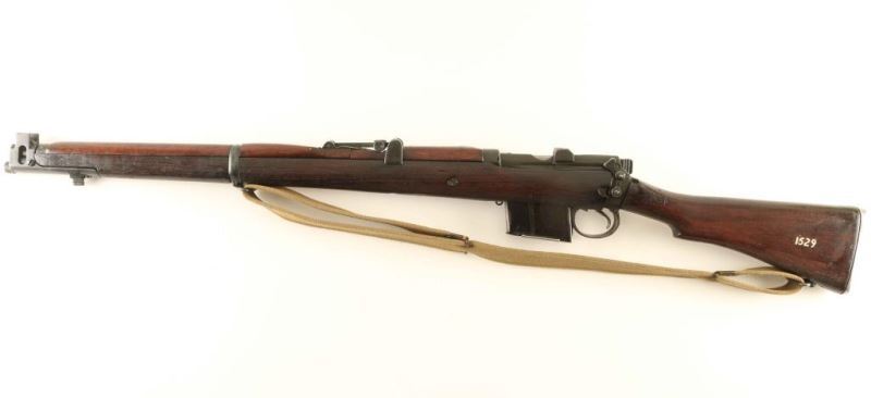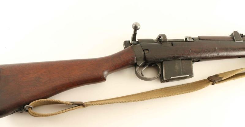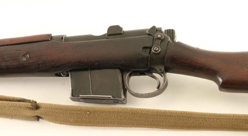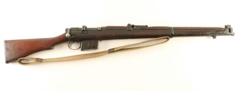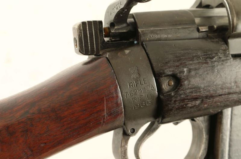 Indian military magazine fed bolt action service rifle chambered in 7.62x51mm NATO, manufactured circa 1965. Imported by Navy Arms Co. of Ridgefield, N.J. with import marks on the right side of the receiver. Features a blued finish, 25.2" barrel, raised patridge front sight, shrouded leaf type rear sight graduated to 2,000 yards, metal nosecap with bayonet lug & square protective front sight ears, single barrel band, serrated trigger, detachable 10 round .308 magazine, manual safety on the left side of the receiver, tan canvas sling, charge loading bridge on the receiver, smooth full-length wood hand guard & forend and straight grip shoulder stock with metal trapdoor buttplate. The right side of the butt socket is marked "[ashoka]/RIFLE/7.62MM2A/R.F.I./1965" and the barrel is marked with a "*" over the chamber. Serial numbers match on the receiver, barrel, bolt handle, rear sight and nose cap. The rifle shows a mottled grey patina on the barrel & receiver and strong bluing on the nose cap, barrel band & magazine. Action is smooth, the bore is excellent and the wood stocks are good to very good. Condition is near NRA Very Good. ***C&R Firearm*** From The John F Sukey Collection