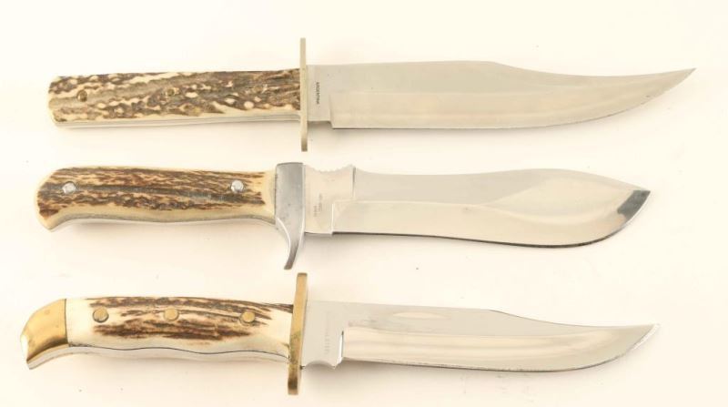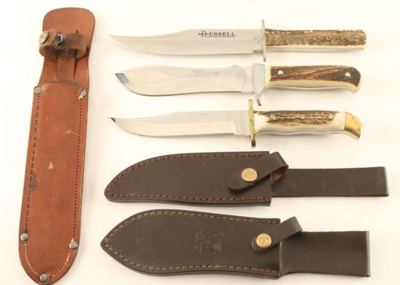 (1) Ole Smokey 10"overall with 5"blade (1)Hen&Rooster Knife 10.5"overall with 5"blade(1) Modern J. Russell Skinner 11.5" 7"blade. All include sheaths