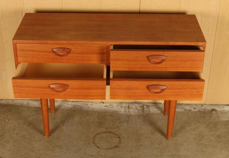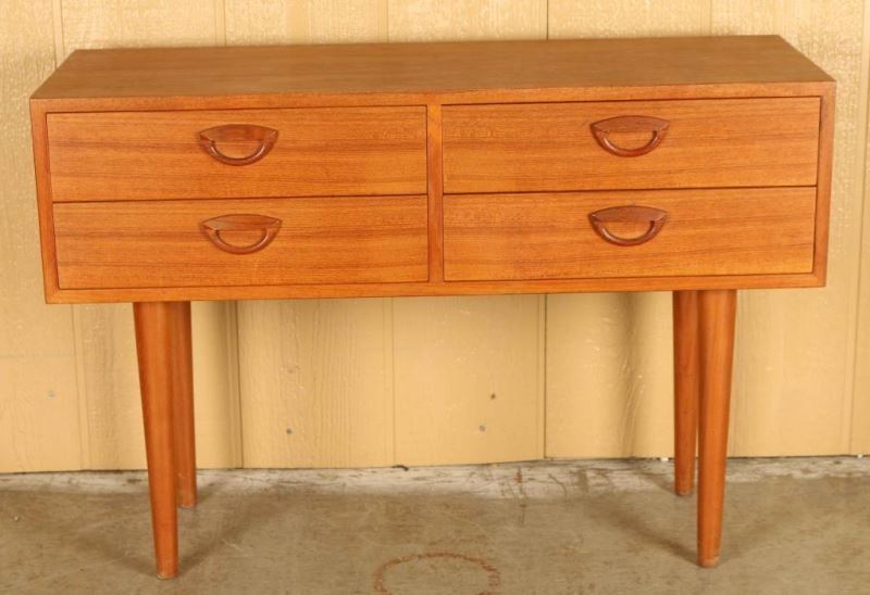 Contemporary table with nice wood grain with four drawers in front that have natural wood pulls. Measures 33 3/4"l x 23"h x 12 1/2"w. Some scratches on the side, otherwise good.