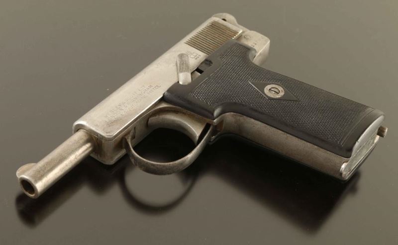English made blowback operated semi-automatic pistol chambered in 7.65mm, manufactured circa 1908-WWII. Features a nickel plated finish, 3.5" barrel, round blade front sight, 'v' notched rear sight, smooth trigger, manual safety, serrated round hammer spur, push button magazine release, 8 round magazine, release manual safety and two-piece black hard rubber grips with diamond checkering. The serial numbers on the frame, barrel & slide are matching. Includes a spare magazine. The pistol has very little remaining finish with the majority of the metal surfaces in-the-white. The slide shows some blooding type erosion and the recoil spring appears under powered as the slide when pulled rearward will not return to battery without assistance. Spring issue aside the pistol appears mechanically sound, the bore is very good with a small amount of surface rust towards the muzzle, markings are clear and the hard rubber grips are very good & are possibly reproduction. The slide rubs along the tops of the grips which also contributes to the slide not returning to battery once pulled back and released. Condition is NRA Fair. ***C&R Firearm*** From The John F Sukey Collection