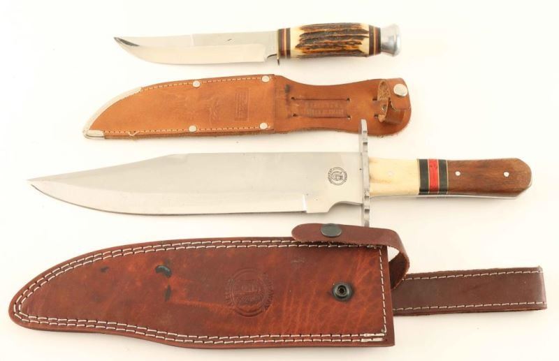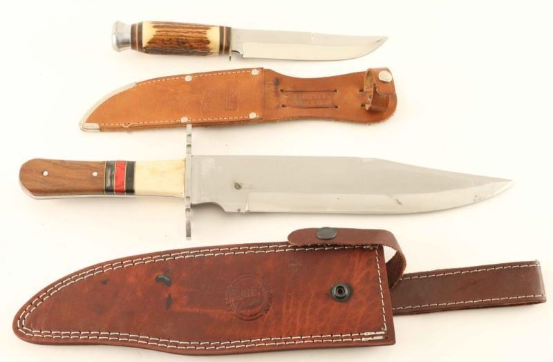 (1) Chipaway Bowie with inlaid fancy handle 15"overall with a 10"blade (1) Compass Knife made in Germany with antler handle 9"overall with a 5"blade both include sheathes