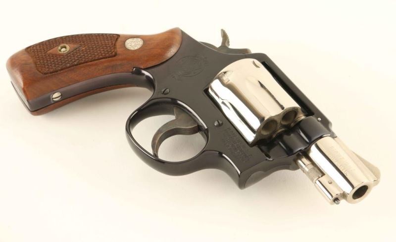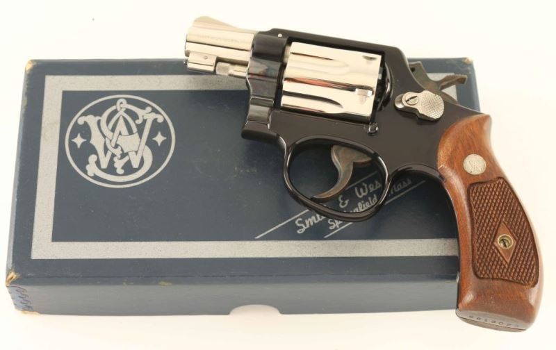 '38 Military & Police Airweight' Lightweight medium frame double action revolver chambered in 38 Special, manufactured circa 1967. Features a dual toned nickel plated and black finish, pinned 2" barrel with sighting rib, ramp front sight, square notched rear sight, non-shrouded ejector rod, fluted six-shot cylinder, serrated .240" trigger, .240" hammer, flat latched thumb piece, three screw square butt K alloy service frame and two-piece diamond checkered walnut Magna grips with silver S&W medallions. Includes the original factory two-piece cardboard box with correct label, instructions, paper and tools. The revolver retains approx. 99% of it's original finish showing a faint drag line on the cylinder with no other observed wear. Action is smooth with very good lock up, bore is pristine and the matching wood grips are fine. Condition is near NRA Perfect in box. ***C&R Firearm****