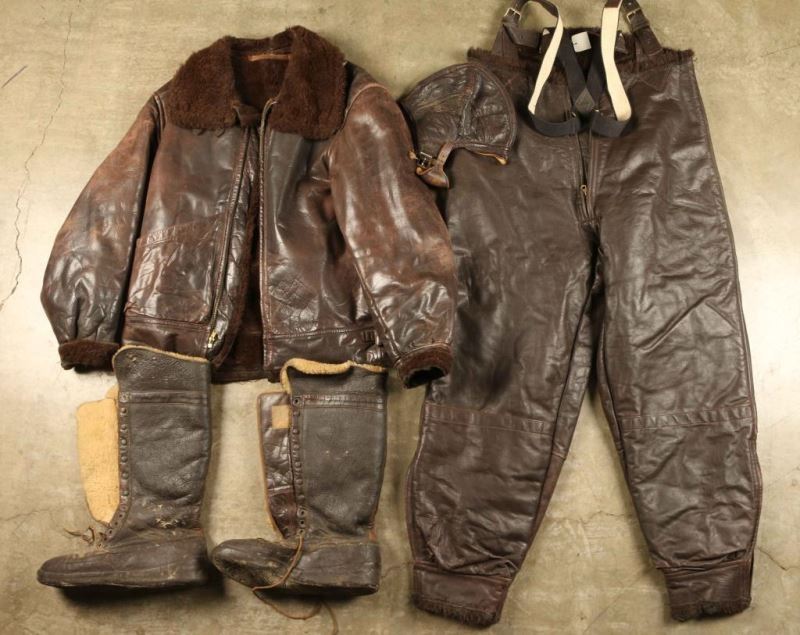 Including; Leather jacket with faux fur collar and lining, shows age, faux fur lined trousers and a pair of lace up shearling lined boots and leather helmet.