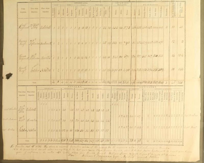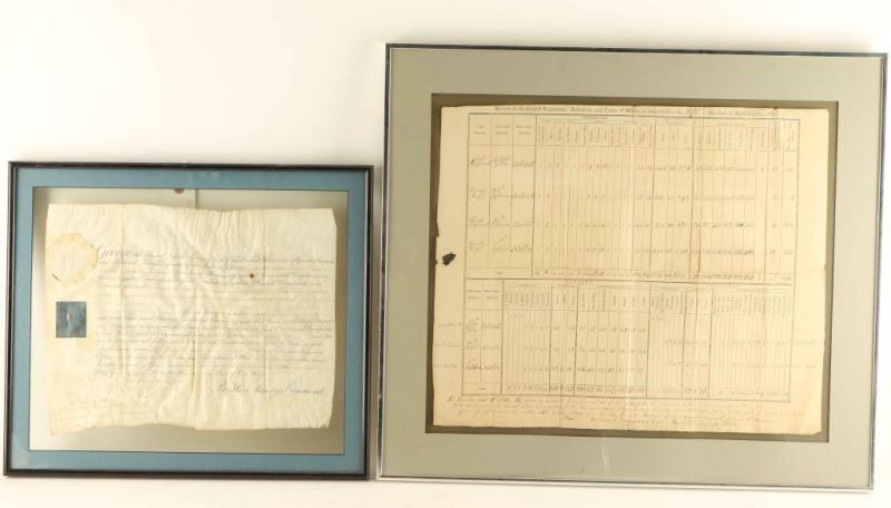 "Return of the feveral Regiments, Battalions and Corps of Militia, as infpected in the Fifth Divifion of Massachusets, 1802. Listing officers, infantry, arms and armaments. Document measures 16 1/4"x19 1/8" with single mat in silver metal frame. Hole in left side of paper. Document appointing a Major to His Majesty's Command, July 4, 1805. with single mat and black metal frame. Document measures 11"x14 1/2", shows age. From The John F Sukey Collection