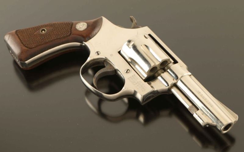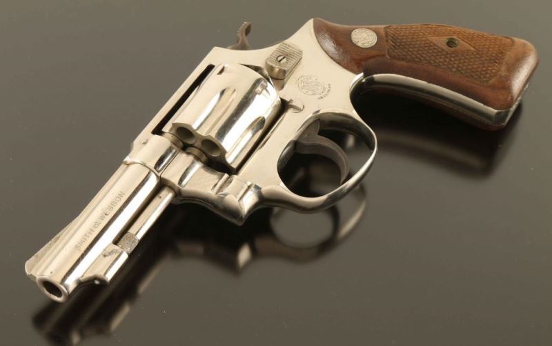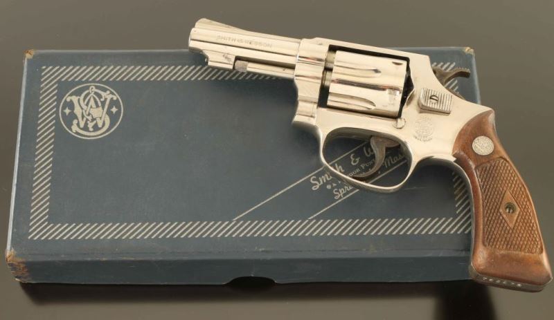 'The .32 Regulation Police' Small frame double action revolver chambered in 32 Smith & Wesson Long, manufactured circa 1961. Features a nickel plated finish, pinned 3" barrel with matted sighting rib, serrated ramped front sight, square notched rear sight, non-shrouded ejector rod, fluted six-shot cylinder, serrated .240" trigger, .240" hammer, flat latch thumb piece, three screw round butt J frame and two piece diamond checkered walnut Magna grips with silver S&W medallions. Includes a factory two piece blue cardboard box with paper. The revolver shows no major losses to it's original nickel plated finish but shows moderate handling marks throughout. Action is smooth with very good lock up, the bore is excellent and the wood grips are good with semi worn points. Condition is NRA Good++ in box ***C&R Firearm****