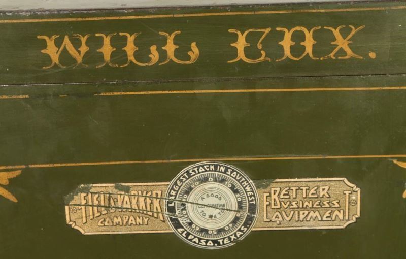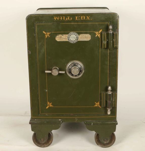 Early 1900s metal safe with original green paint. "Will Cox" painted on top with 'Field Parker Co. Safe, Better Business Equipment' decal. Good condition, comes with combo, on casters to move with ease. Measures 15 1/2"l x 25 1/2"h x 16 1/2"w.