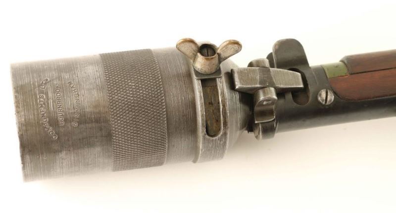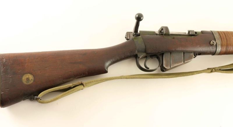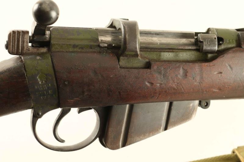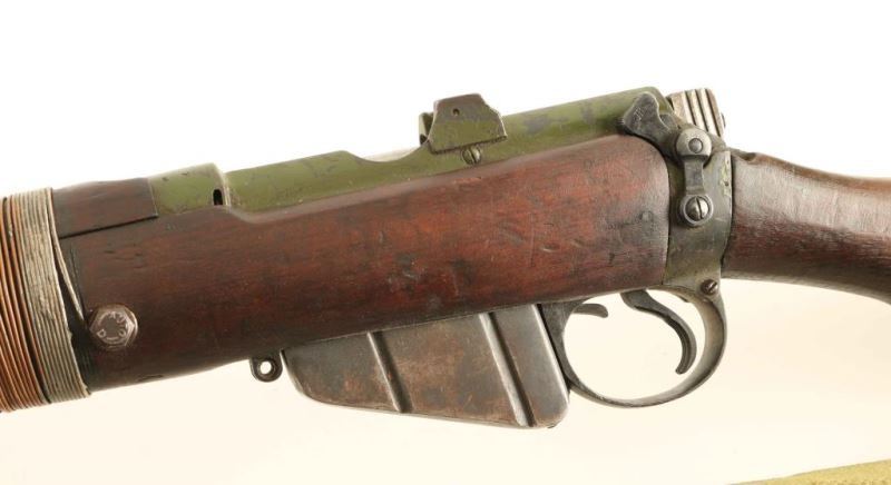 Sn: S5625 British military magazine fed bolt action grenade launching rifle chambered in .303 British. Manufactured circa 1918. Features a blued/green painted finish, 25.2" barrel, cup style grenade launcher marked 'Bournbrook', raised patridge front sight, leaf type rear sight graduated to 2000yds, metal nosecap with bayonet lug and protective sight ears, single barrel band, serrated trigger, detachable 10Rd magazine, manual safety on the left side of the receiver, green canvas sling, charge loading bridge on the receiver, wire wrapped full length hand guard and forend, straight grip shoulder stock with brass disc and brass trapdoor buttplate. The right side of the butt socket is marked '[crown]/G.R./ Enfield/1918 and SHT L.E/III*'. Stock and receiver are marked 'EY'. Brass disc is marked '1358'. Serial numbers match on the receiver, rear sight and nosecap. Receiver barrel and handguard have been painted green with approximately 75% finish intact. Remainder of the metal finishes show strong bluing. Action performs well, bore is very good and the wood stocks are good with dings and a repair to the handguard. Condition is NRA Good ***C&R Firearm*** From The John F Sukey Collection