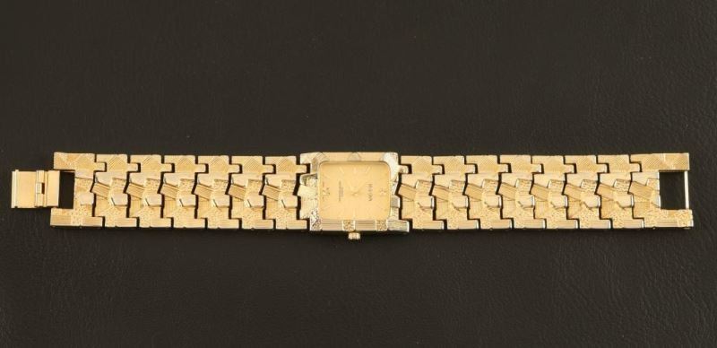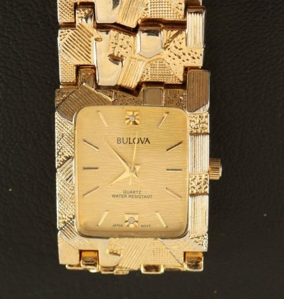 Square face with swiss quartz movement. Rustic gold nugget design on band.