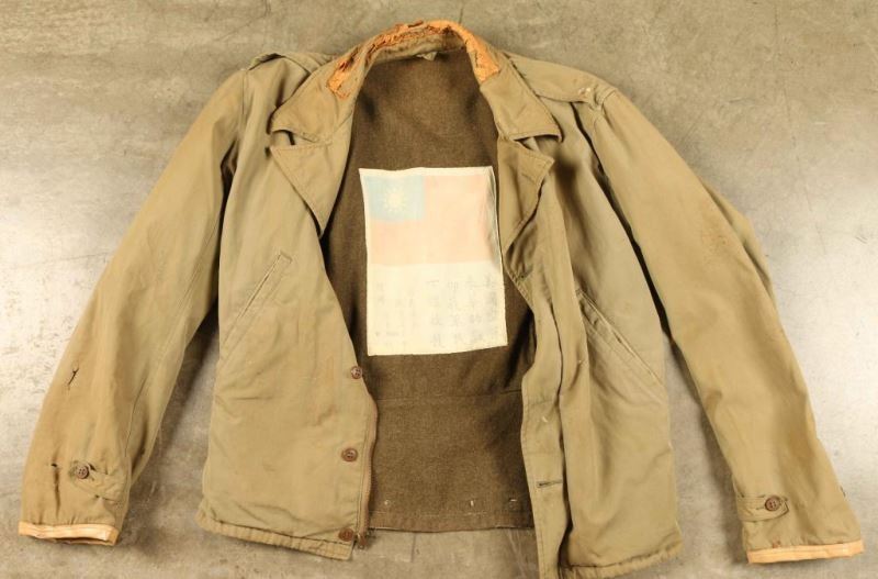 ODU green with leather at back of collar which is wearing away. Inside green wool lining has silk patch with Chinese flag and characters. Some stains otherwise good. Circa 1940s