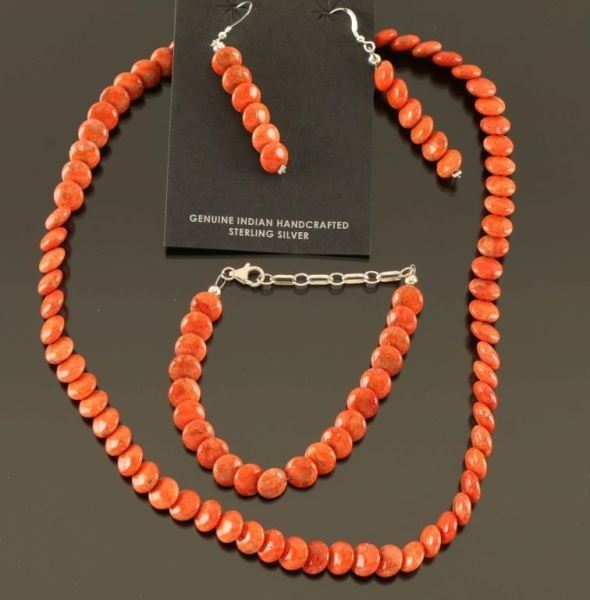 Colorful 9mm wide coins of genuine Apple Coral slightly overlap in this matching ensemble. The choker is about 19" long, including the hook/eye clasp. The dangle earrings, including the french hook are about 2 1/4" long and the bracelet is 8 3/4" long. Designed and strung by Navajo Lula Begay.
