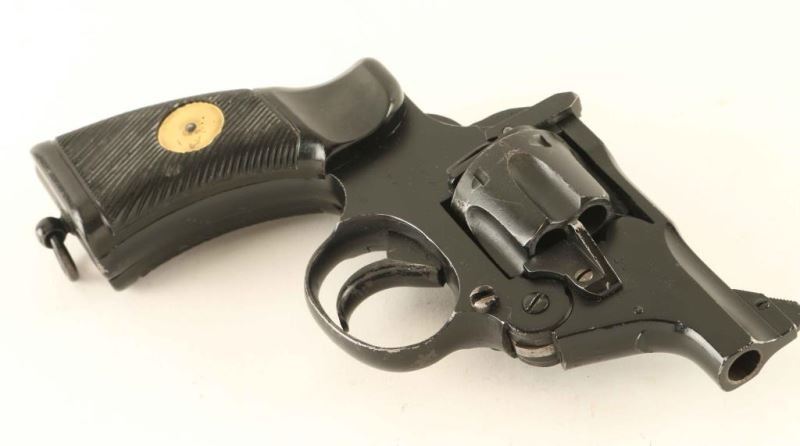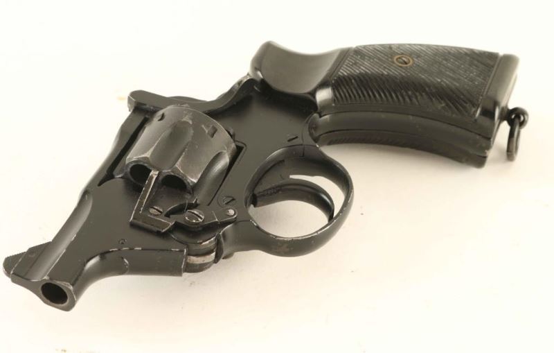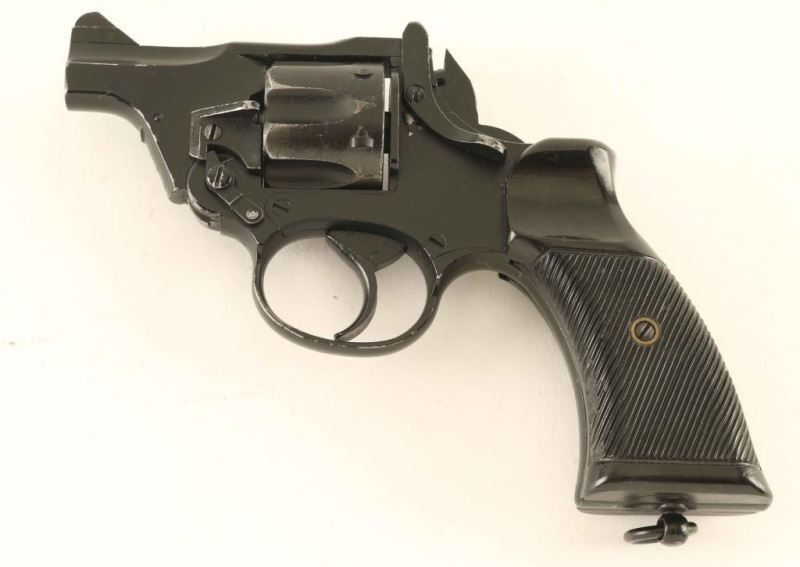 Altered WWII Era English military top-break double-action-only revolver chambered in .38 Smith & Wesson. Features a black painted finish, cut-down 2" bbl, ramp front sight, square notched rear sight on the barrel catch, fluted six-shot cylinder, automatic extractor, smooth trigger, bobbed hammer, square butt frame with lanyard ring and two-piece grooved hard rubber grips with thumb rests. The serial numbers on the frame, barrel and cylinder are all matching. Markings: Frame - a superimposed "ED," "I**," & "FTR/54" and the barrel shows English proof house marks. The revolver exhibits approximately 90% of it's black finish showing scattered wear with losses concentrated on the cylinder. Action is smooth with very good lock-up, bore is very good with some minor rust or pitting, markings are fair and the hard rubber grips are very good. Condition is NRA Good as modified. ***C&R Firearm*** From The John F Sukey Collection
