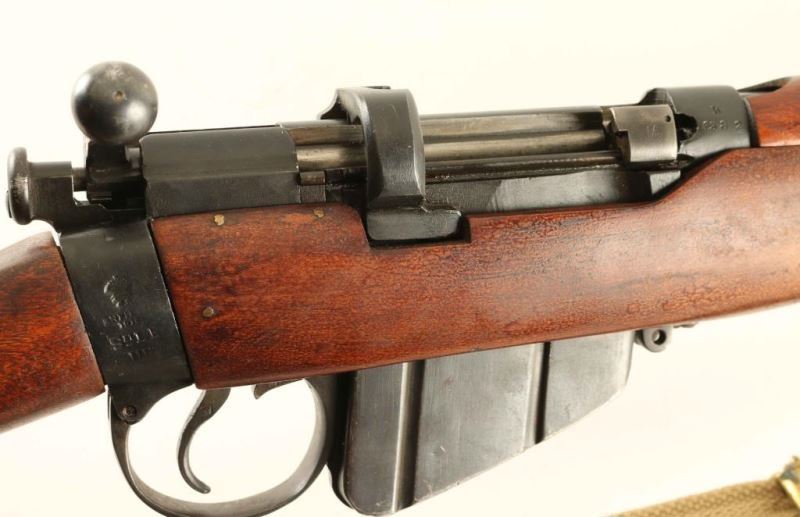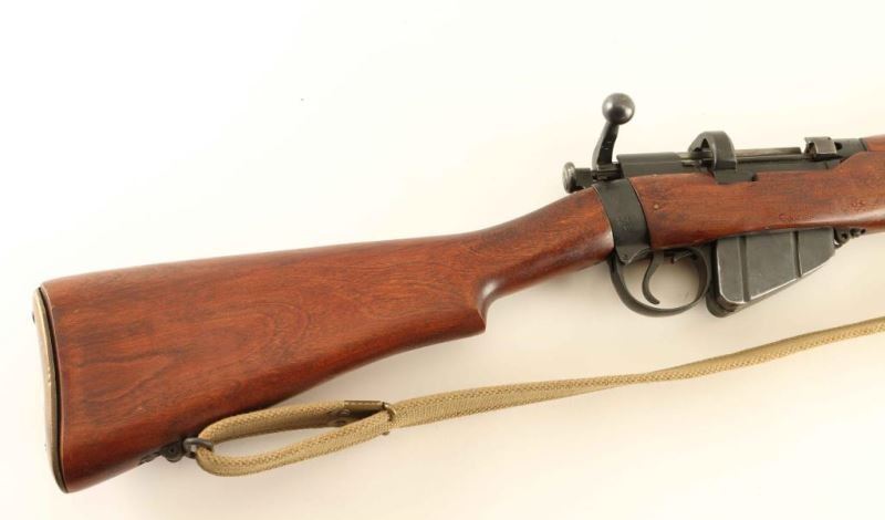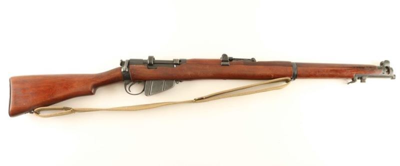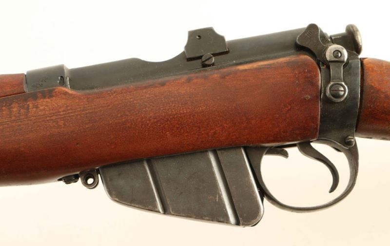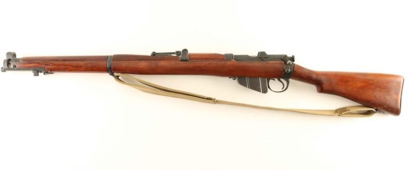 British military magazine fed bolt action service rifle chambered in .303 British. Manufactured circa 1918. Features a blued finish, 25.2" barrel, raised patridge front sight, leaf type rear sight graduated to 2000yds, metal nosecap with bayonet lug and protective sight ears, single barrel band, serrated trigger, detachable 10Rd magazine, manual safety on the left side of the receiver, canvas sling, charge loading bridge on the receiver, full length hand guard, forend, straight grip shoulder stock with brass trapdoor buttplate. The right side of the butt socket is marked '[crown]/G.R./ Enfield/1918 and SHT L.E/III*'. The receiver is stamped 'F' inside a circle. The underside of the wrist is stamped with a '[broad arrow] inside a circle' and the heel is stamped 'L'. The forend is stamped SLAZ/50 B 8'. Serial numbers are matching on receiver and rear sight (forced). Rifle exhibits approximately 95% of its blued finish showing little wear. Action is smooth, bore is pristine and the wood stocks are fine though the buttstock slightly ill fitting. Condition is NRA Excellent as refinished ***C&R Firearm*** From The John F Sukey Collection