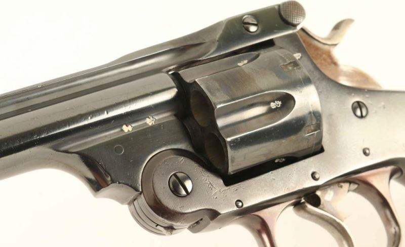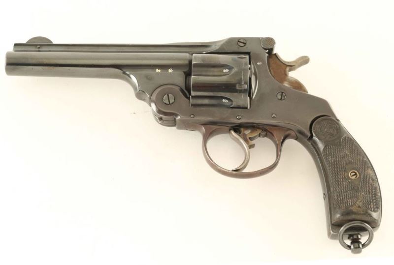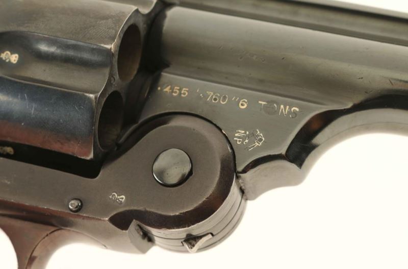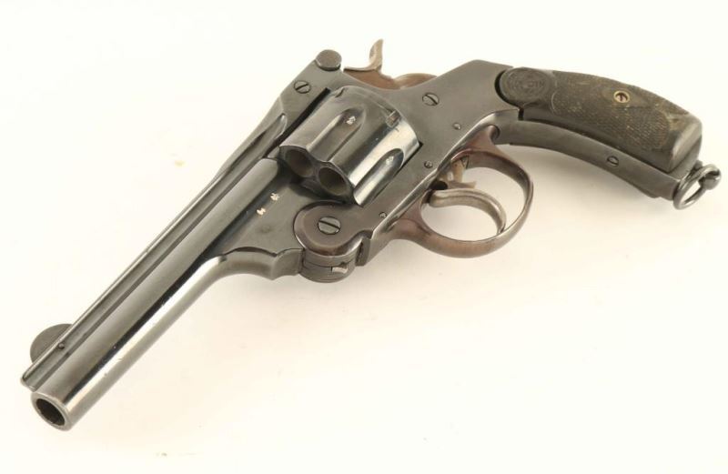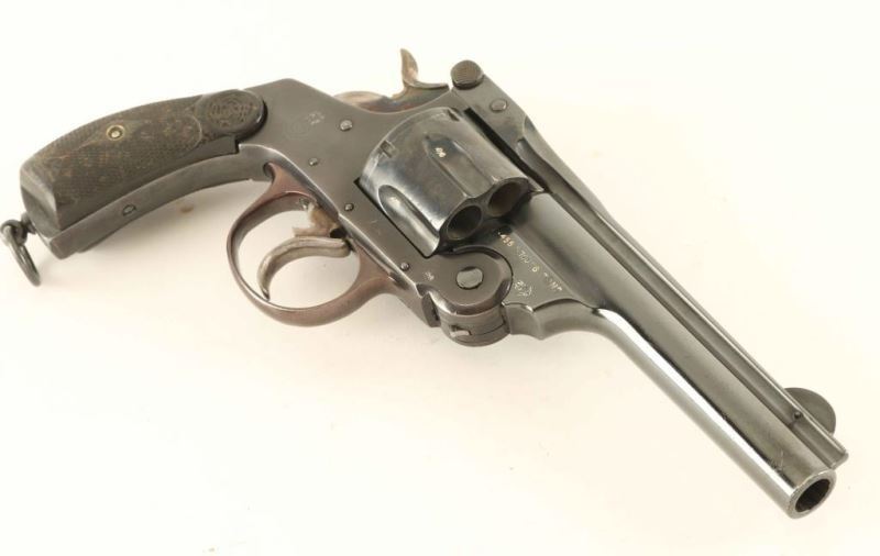 Smith & Wesson pattern top-break double action revolver chambered in .455 Eley. Features a blued finish, 5" bbl with sighting rib, pinned round blade front sight, notched rear sight on the barrel latch, fluted six-shot cylinder with automatic extractor, smooth trigger, knurled hammer spur, lanyard ring and two-piece diamond checkered hard rubber grips with GAC monograms on the top of the panels. Displays English proof house marks and Garate Anitua y Cia barrel address. Approximately 60% of the reblued finish is retained with deeper blue on the barrel and plum color on the frame. Action is sound with good luck-up, the bore is excellent, markings are very good and the hard rubber grips are good. Condition is NRA Good. ***C&R Firearm*** From The John F Sukey Collection