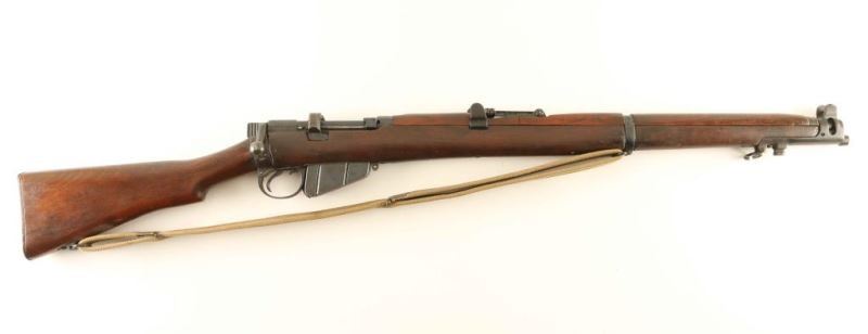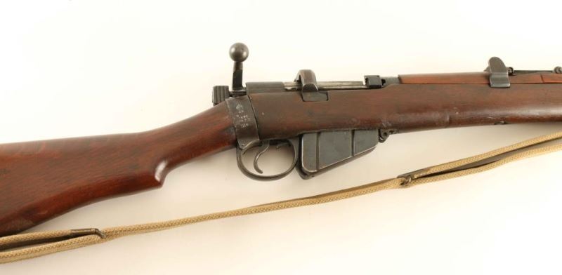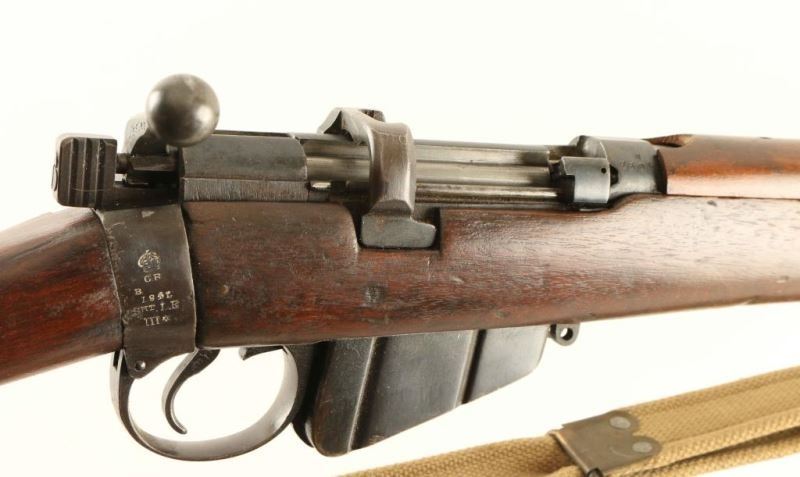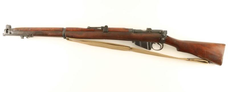 SN: M75043 British military magazine fed bolt action service rifle chambered in .303 British. Manufactured circa 1941. Features a blued finish, 25.2" barrel, raised patridge front sight, leaf type rear sight graduated to 2000yds, metal nosecap with bayonet lug and protective sight ears, single barrel band, serrated trigger, detachable 10Rd magazine, manual safety on the left side of the receiver, canvas sling, charge loading bridge on the receiver, full length hand guard, forend, straight grip shoulder stock with brass trapdoor buttplate containing oiler. The right side of the butt socket is marked '[crown]/G.R/B/1941 and SHT L.E/III*'. The stock is marked 'J.V.J Jr.' Serial numbers are matching on receiver, bolt handle and rear sight. Rifle exhibits approximately 85% of its blued finish showing light wear some pitting on the right side of the butt socket and light surface rust on the rear sight ears and barrel band. Action is smooth, bore is very good and the wood stocks are very good. Condition is near NRA Very Good ***C&R Firearm*** From The John F Sukey Collection