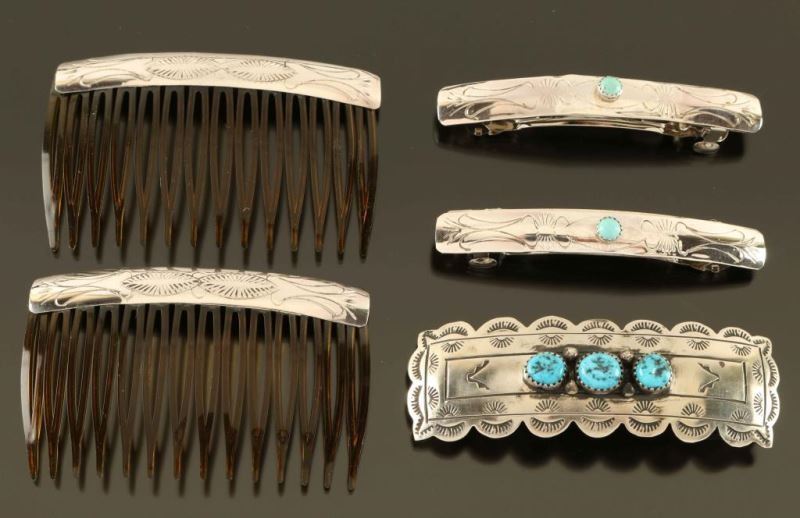 Including; Barrette with hammered German silver and three bezel set Kingman turquoise nuggets with stamped traditional designs. Measures 3"l x 1"w. (2) Navajo Sterling Hair Combs with hammered silver bars with traditional patterns attached to plastic combs. Made by Native American silversmith Randy Dalgai. (2) Turquoise and Silver Barrettes stamped with traditional patterns and a round center stone of Kingman turquoise mounted on spring clips. Measure 2 3/4"l x 3/8"w also made by Navajo Randy Dalgai.