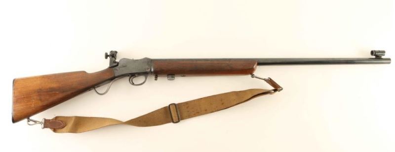 British made small frame martini action single shot rifle chambered in .220 Long Rifle. Imported by Navy Arms Co. with import marks on the underside of the barrel. Features a blued finish, 29" barrel, Parker Hale globe front sight. receiver mounted Parker Hale PH7A adjustable sight with variable aperture rear sight, polished feed ramp, cocked indicator, serrated trigger, canvas sling, checkered walnut beavertail forend with Parker Hale font sight insert container and straight grip shoulder stock with factory buttplate. Rifle retains approximately 60% of it's blued finish showing scattered surface rust. Action is crisp, the bore is very good and the wood stocks are good with worn checkering & blemishes. Condition is NRA Good. ***C&R Firearm*** From The John F Sukey Collection