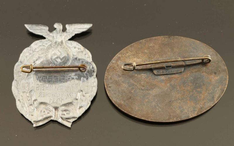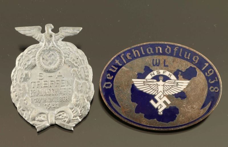German WWII 1938 NSFK Deutschlandflug Glider Korps Badge. Measures 2 1/8” wide by 1 9/16” tall. The reverse side is maker marked ‘G Brehmer ges gesch’. Has a thin horizontal pin back. One piece nickel construction with enamel. German WWII 1931 SA Treffen Braunschweig Breast Badge. Measures 1 3/8” wide by 1 7/8” tall. The front reads ‘S – A Treffen Braubschweig 17/18 Oktober 1931’. Has a thin horizontal safety pin back. Stamped nickel construction. Sold as is unknown age.