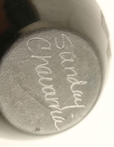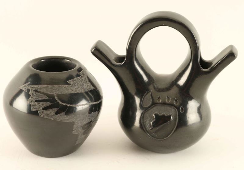 One wedding vase with bear paw design signed Lawrence Perez 5 1/2"h x 5 1/2"w and a pot with etched eagle design signed Sunday Cavarria and Eugenie Gutierrez 3 3/4"h x 4"dia.