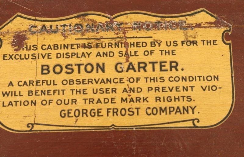 Antique Display and Sale Case of The Boston Garter, George Frost Company. Velvet grip with a rubber button clasp to hold mens socks up. Wood case with glass sides. Measures 14 1/8" x 6" x 9 1/2". Shows age, lid shows repair.