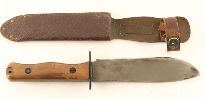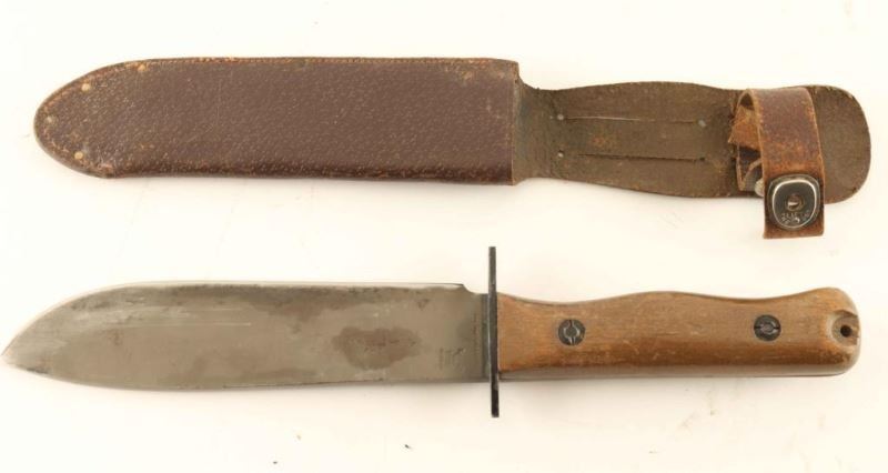 Sword Type D Survival Knife. Wood Handle, maker marked, and numbered 1B/4594 with scabbard. Measures 12.5"overall with a 7"blade. From The John F Sukey Collection