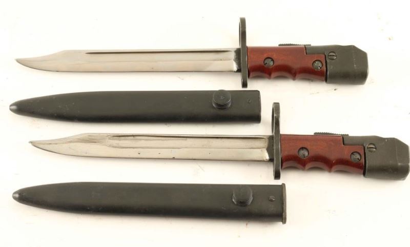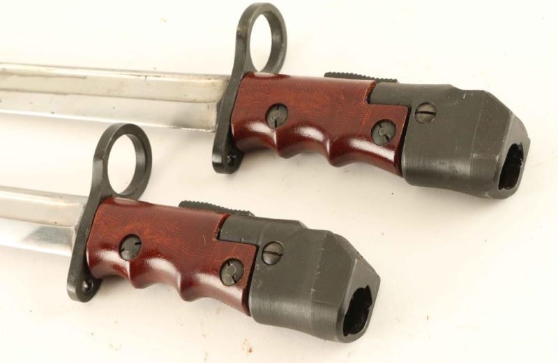 The No. 7 Mk. I/L was a very innovative and complex design, with a unique swiveling pommel. Part knife bayonet and part socket bayonet, the No. 7 Mk. I/L would mount to the Lee Enfield No. 4 rifle and the Mk. V Sten submachine gun. From The John F Sukey Collection