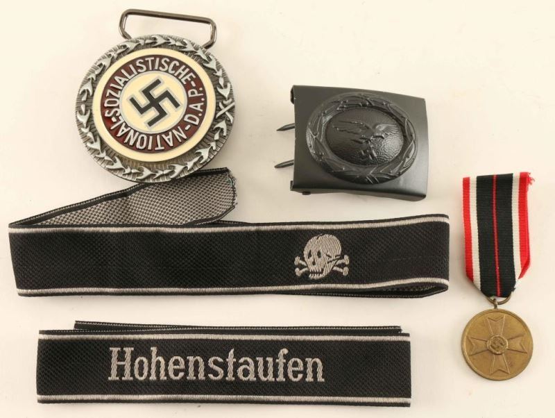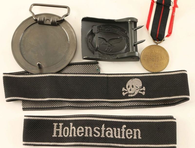 German WWII Luftwaffe Enlisted Mans Belt Buckle. The front shows a flying eagle in the center surrounded by an oval oak leaf wreath. The reverse side is maker marked. ‘A a & s’. Dark grey painted stamped steel construction. German WWII Waffen SS Hohenstaufen EM Cuff Title. Also included is a Waffen SS Totenkopf EM Cuff Title. They measure approximately 19 1/4" long by 1 1/4" tall. Both are bevo cloth woven cotton construction. For an enlisted man. German WWII War Service Decoration. Includes the presentation ribbon. Brass construction. German WWII NSDAP Political Swastika Belt Buckle. Measures 3” in diameter. The front reads ‘National – Sozialistische DAP’. Has a swastika in the center. One piece nickel construction with enamel. As is, unknown age.