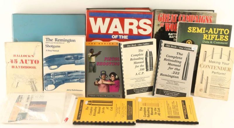 Including: Patton:Ordeal and Triumph by Ladislas Farago, Wars of the 20th Century by Susanne Everett/Brigadier Peter Young, Lyman Reloading Handbook 46th Edition, Legends of the West by Fanny Kelly, A Pictorial HIstory of the World War II Years by Edward Jablonski, Great Campaigns of World War II, Reloading Manuals, NRA Basics of Pistol Shooting, Gun Magazines and more.