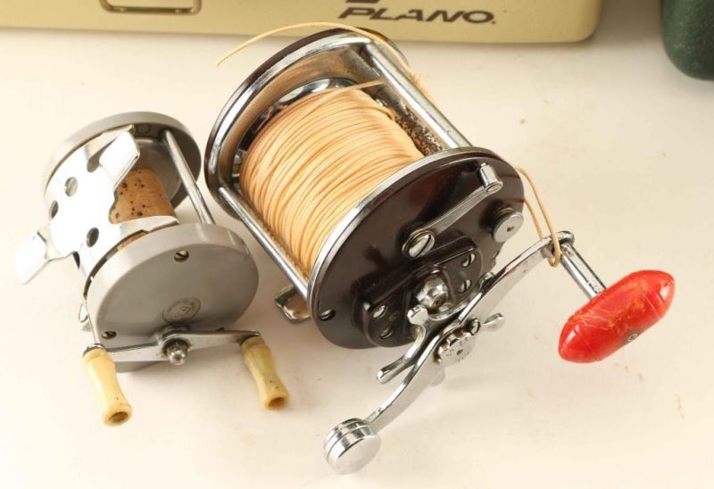 Both boxes have an assortment of hooks, lures, sinkers, fishing line, a Penn Peer Reel No. 209 and an Ocean City Reel made in Philadelphia, PA.