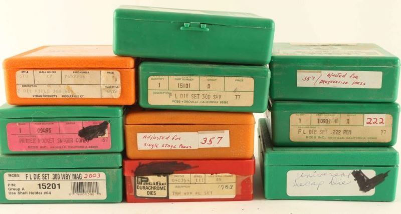Including; RCBS Universal Recap Die, Pacific Durachrome 7mm Wby, RCBS 222, RCBS 222 Rem, RCBS Primer Pocket Swager, RCBS 300 Savage, Lyman 308 Win, RCBS 357 Mag, Lyman 357, and an RCBS 300 Wby Mag.