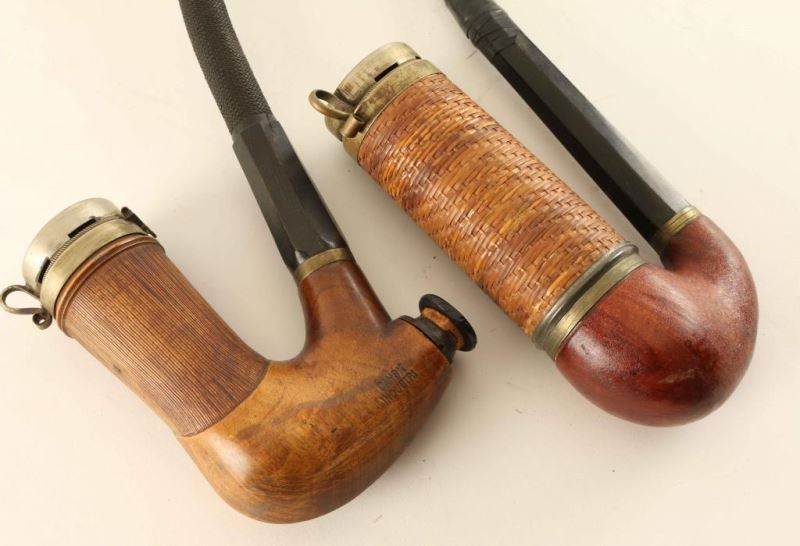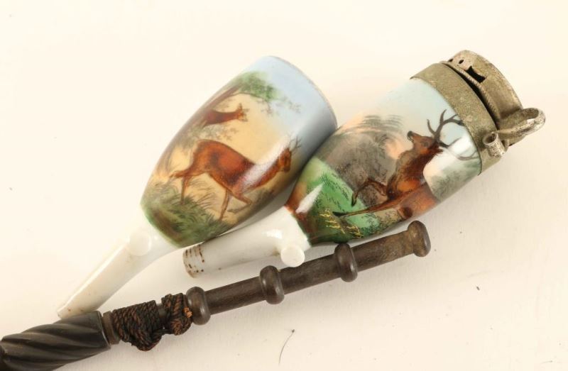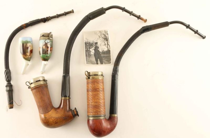Including; 2 porcelain bowls with painted stag scenes-one of which has a pewter top, 2 long stemmed wood bowl pipes, and a photo of Grandpa Nelsen in Denmark smoking one of the long stemmed pipes.
