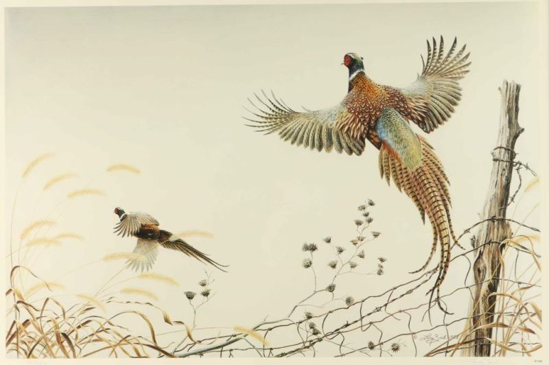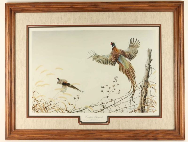 "Fenceline-Ringnecks" 6/500 signed in pencil lower right. Image measures 16 1/2" x 24 1/4" in triple mat with wood frame. 1986 Iowa Pheasants Forever Artist & Print of the Year.