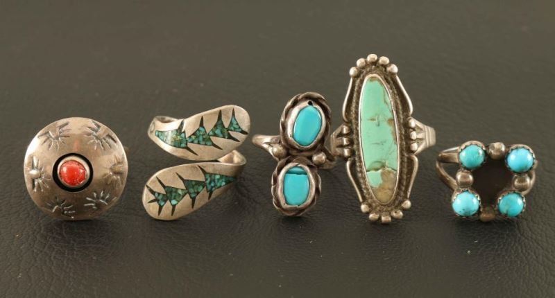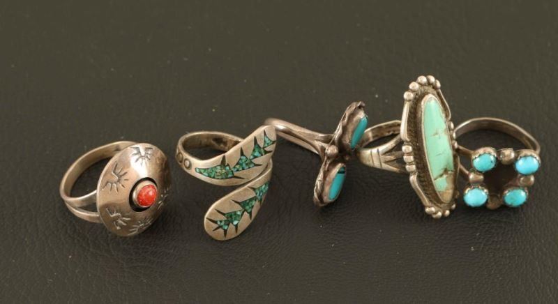 Including; two small ovals of turquoise with rope and bead motif, square of silver with four small turquoise stones, oval of turquoise with traditional border-band has been cut, spoon ring with turquoise chip inlay, and a disc of silver with a coral stone.