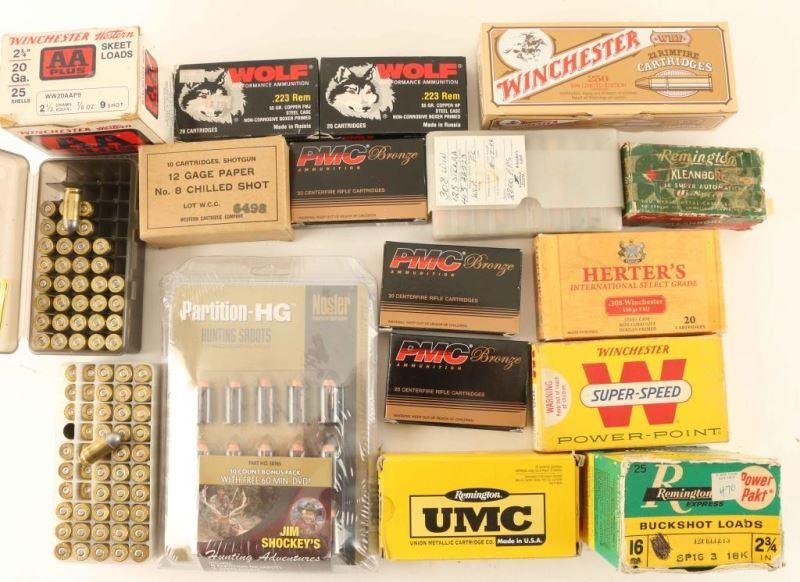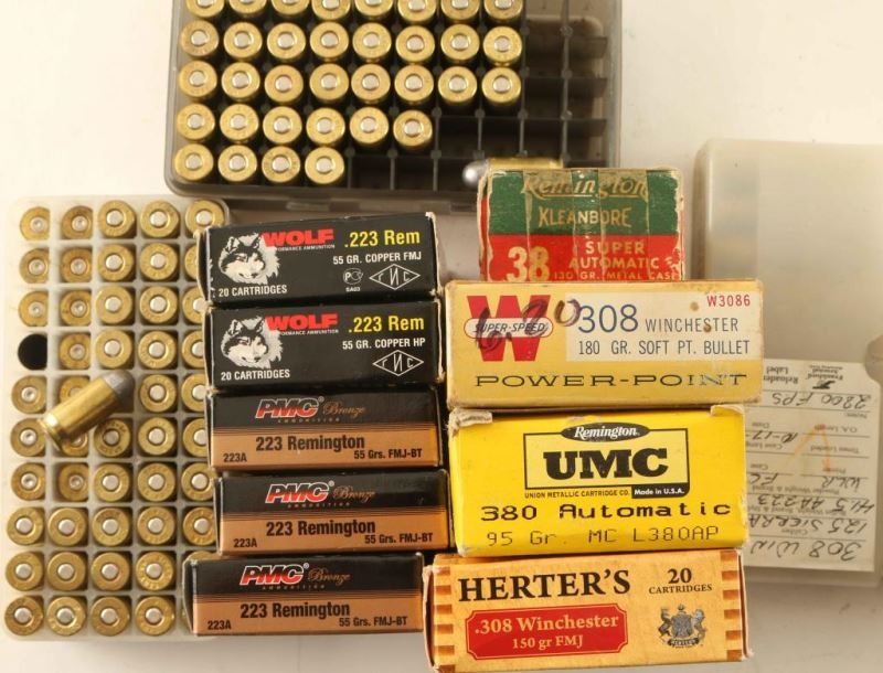 Including; Remington 38 Super Auto, Nosler Partition-HG Hunting Sabots 30 Rds, Wolf 223Rem 40Rds, PMC 223Rem 60Rds, Estate 12Ga 10Rds, UMC 380Auto 50Rds, Winchester 20Ga 25Rds, Remington 16Ga 15Rds, Herter's 308Win 15Rds, Winchester 308Win 20Rds, Winchester 22WRF 250 Rds, and more. Includes reloads in metal ammo can.