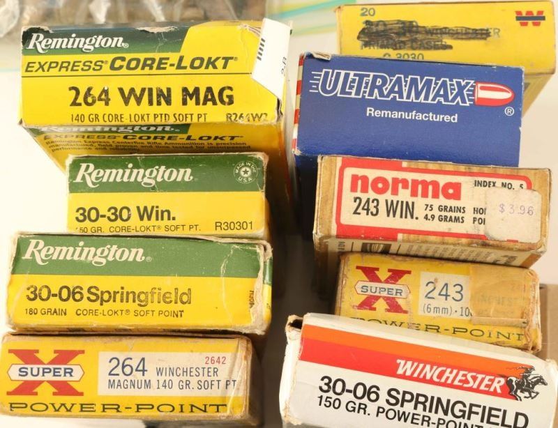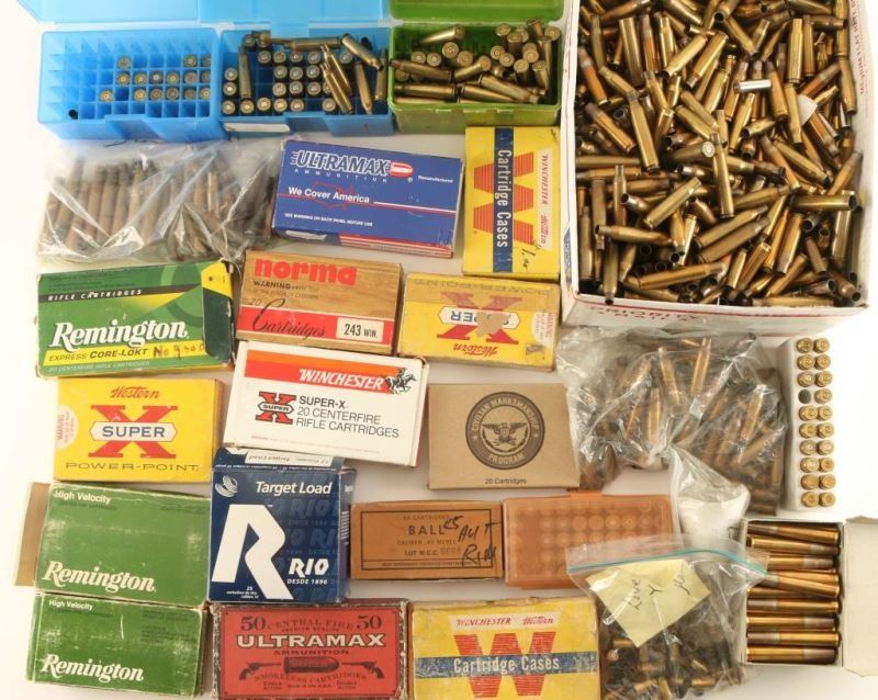 Assorted calibers for handgun and rifle. Some loose, some in boxes.
