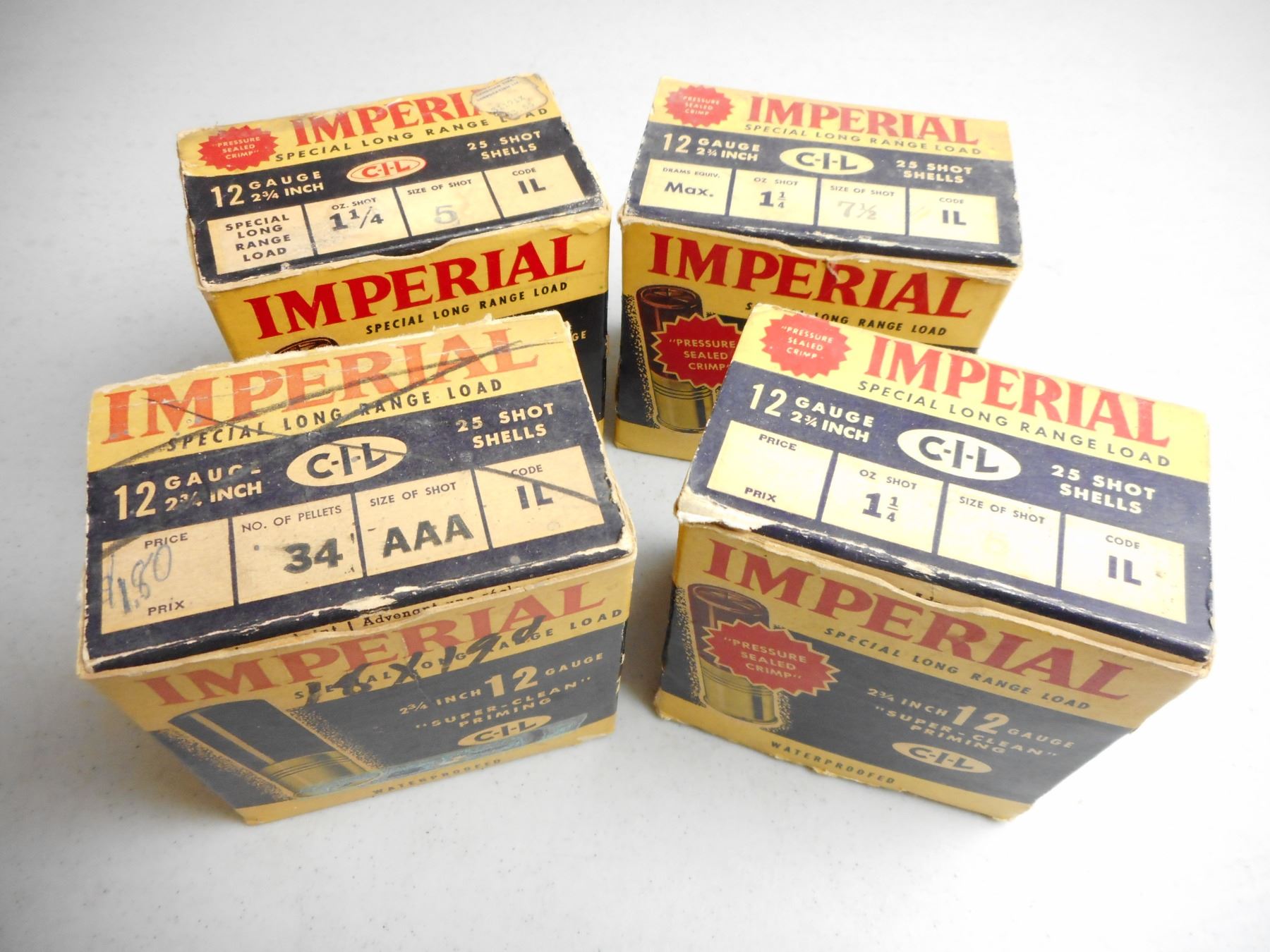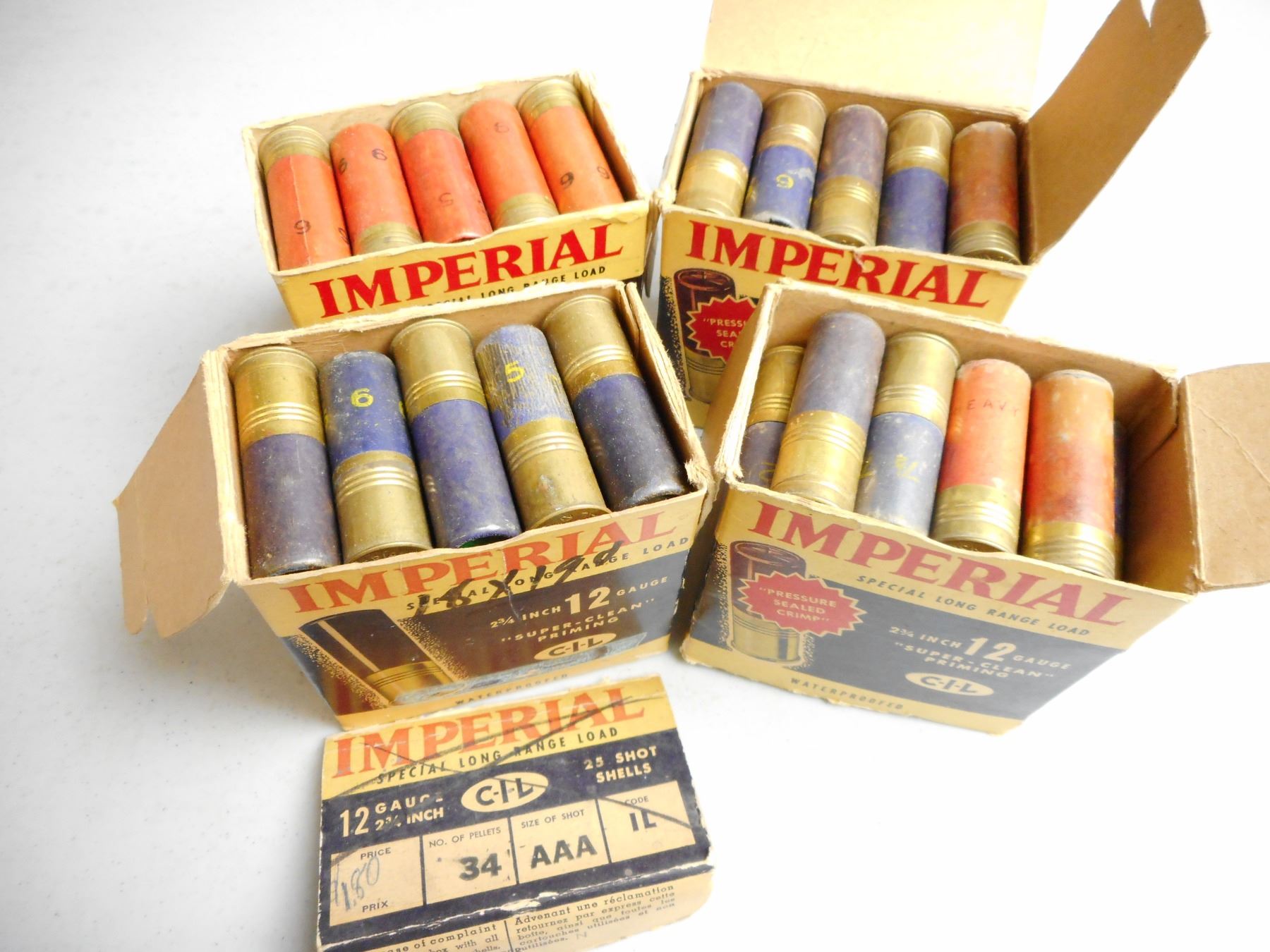 ASSORTED ANTIQUE 12 GA 2 3/4" AMMO , 99 RNDS MOSTLY IMPERIAL SHOT IN IMPERIAL BOXES, INCLUDES SOME CANUCK & DOMINION