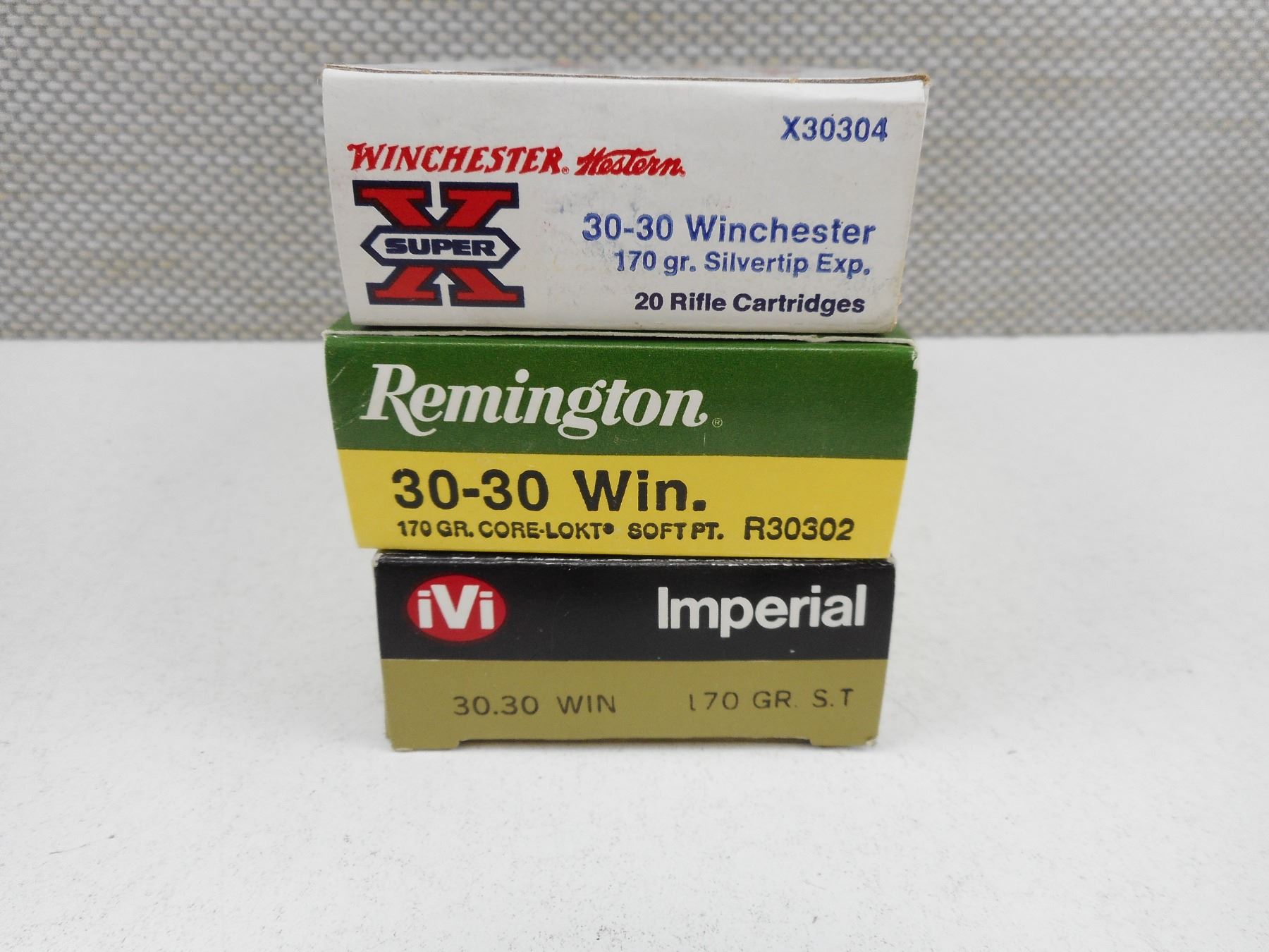 ASSORTED 30-30 WIN AMMO , 60 RNDS INCLUDES REMINGTON 170 GRAIN CORE-LOKT SP, WINCHESTER 170 GRAIN SILVERTIP EXP. & IMPERIAL 170 GRAIN S.T.