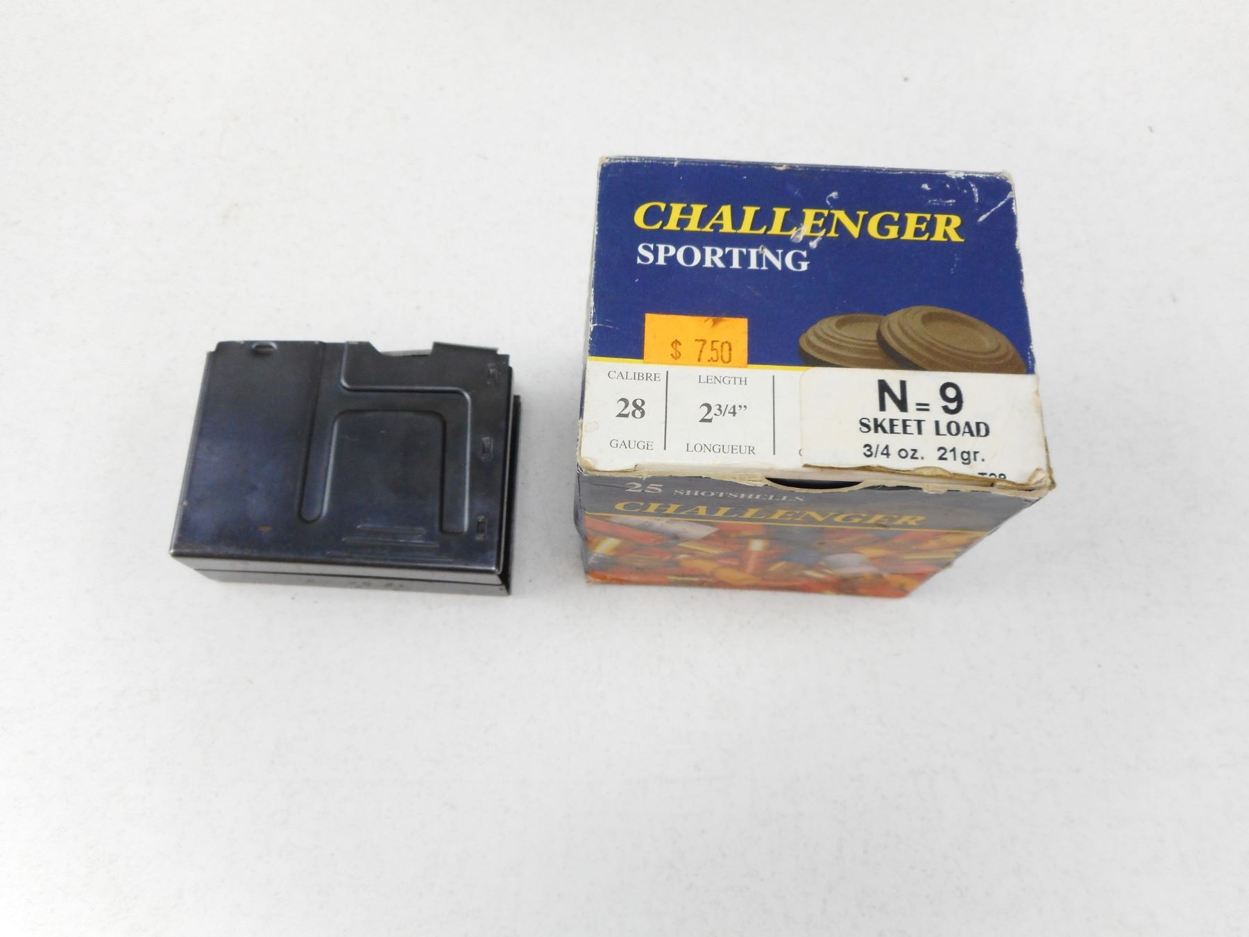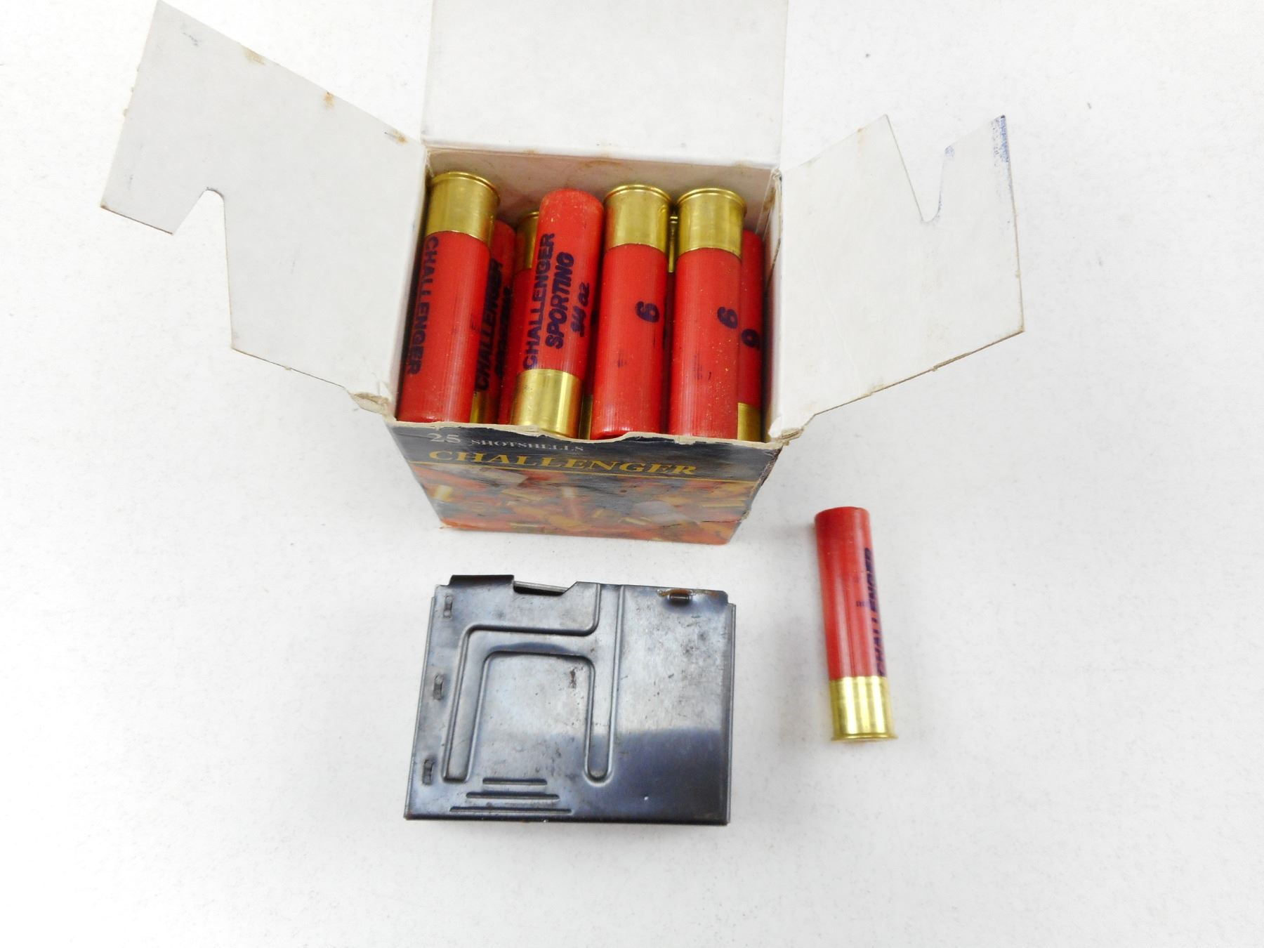 SHOTGUN AMMO & MAGAZINE , 25 RNDS CHALLENGER SPORTING 28 GA 2 3/4" SKEET LOAD AMMO & (1) 12 GA 2 3/4" MAGAZINE FOR A BOLT ACTION SHOTGUN