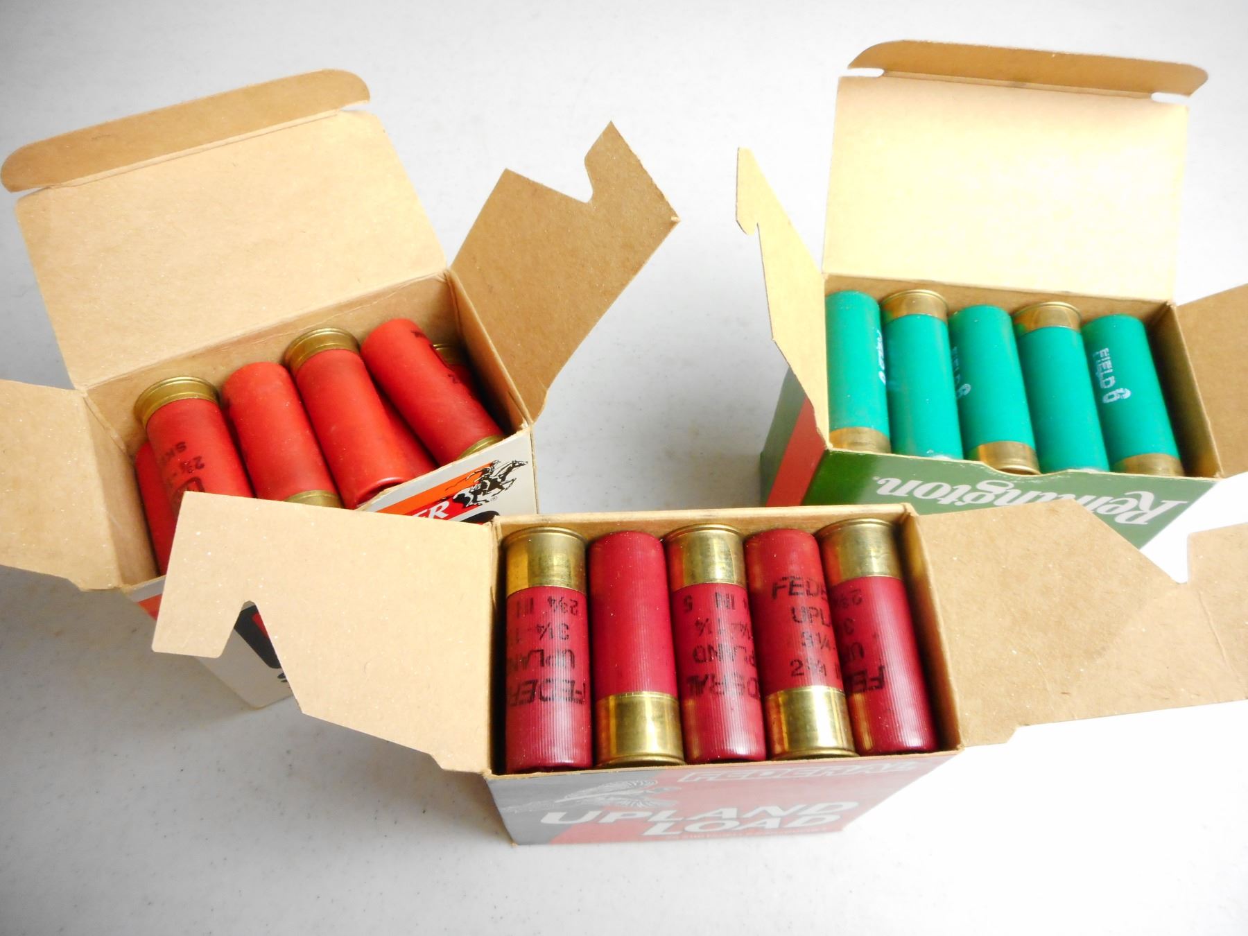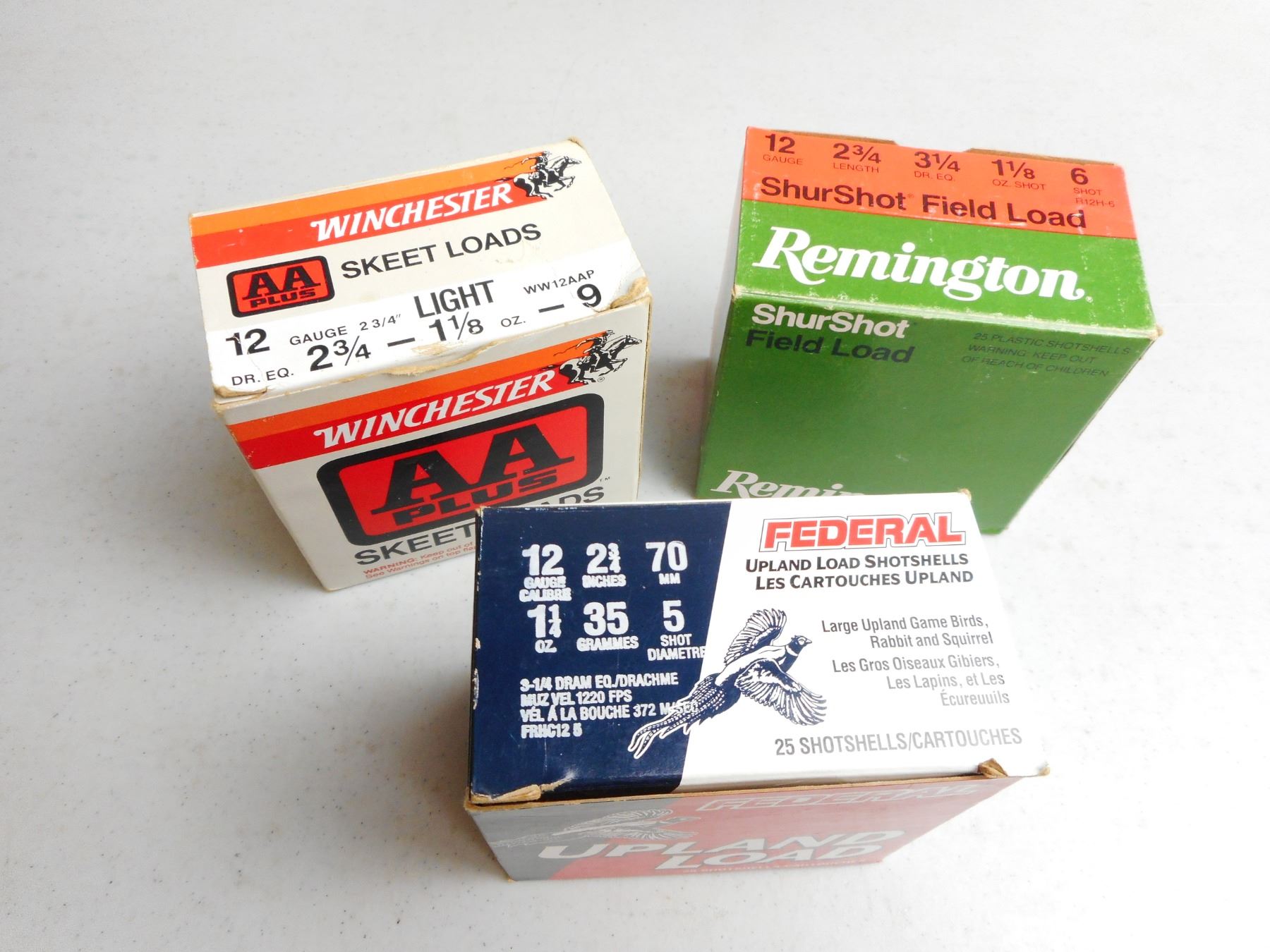 12 GA 2 3/4" SHOTGUN AMMO , 74 RNDS: REMINGTONSHURSHOT FIELD LOADS #6 SHOT, FEDERAL UPLAND LOADS #5 SHOT & WINCHESTER SKEET LOADS 9 SHOT