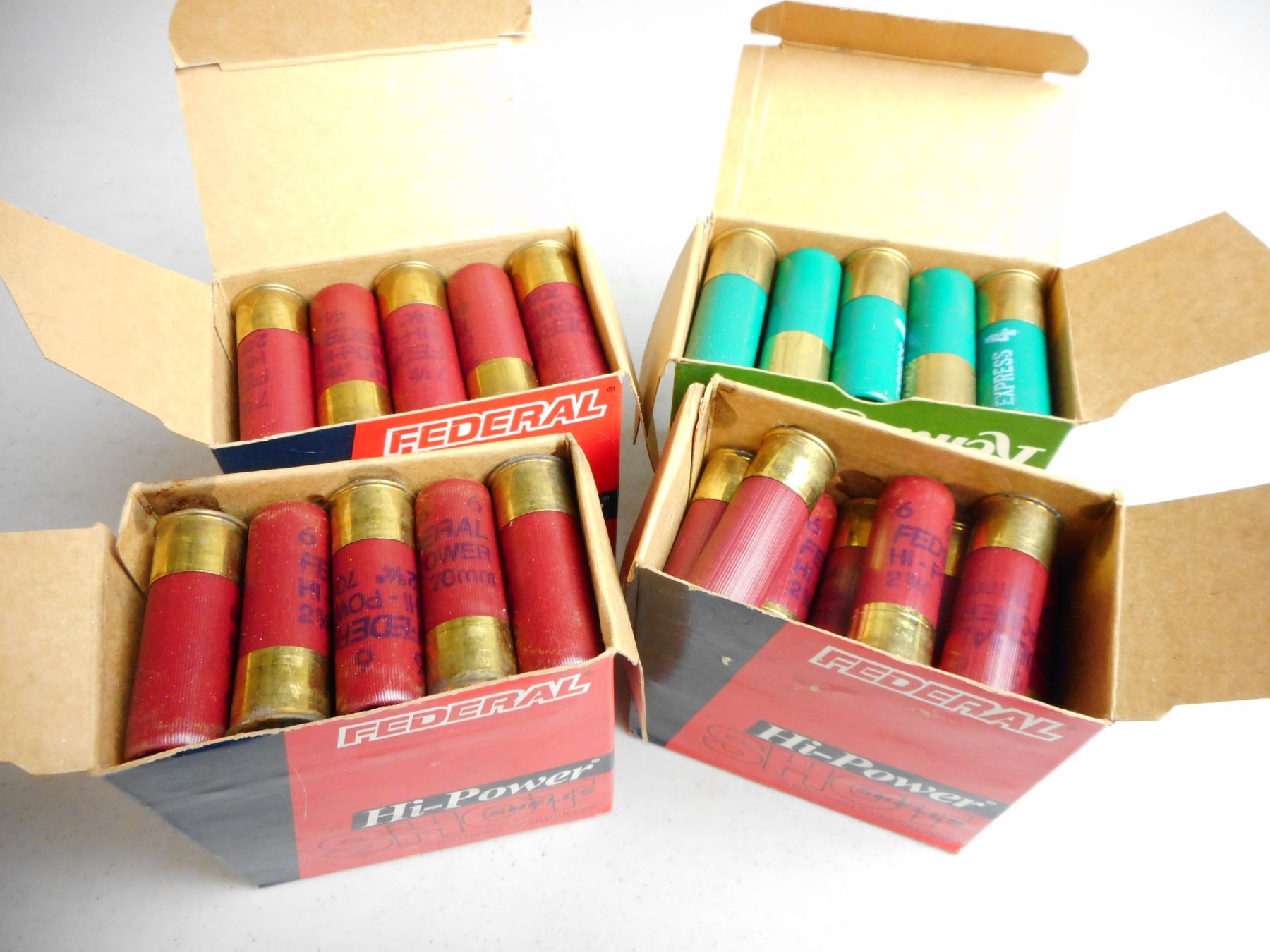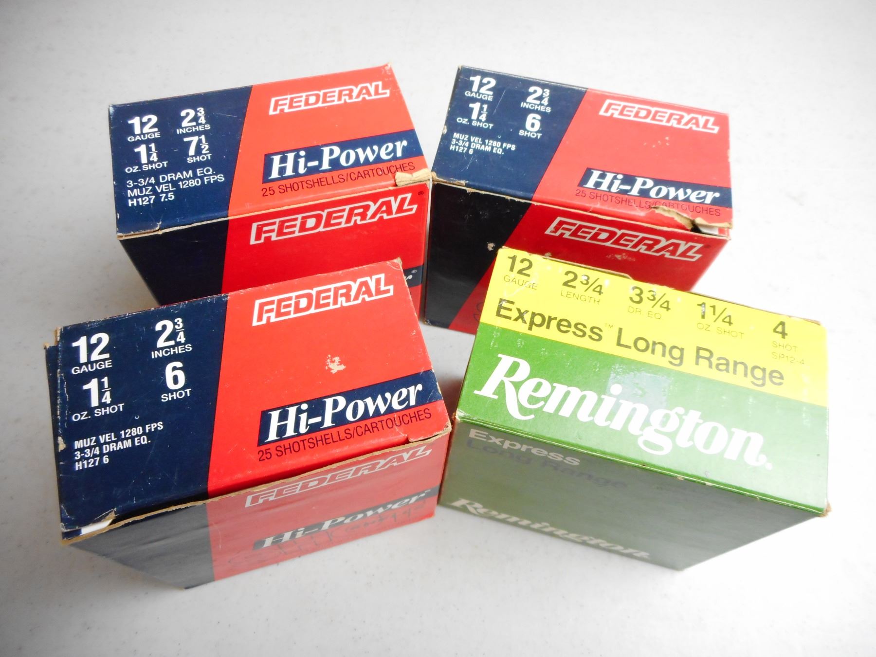 12 GA 2 3/4" SHOTGUN AMMO , 98 RNDS: REMINGTION EXPRESS LONG RANGE # 4 SHOT & FEDERAL HI-POWER#6 & 7 1/2 SHOT
