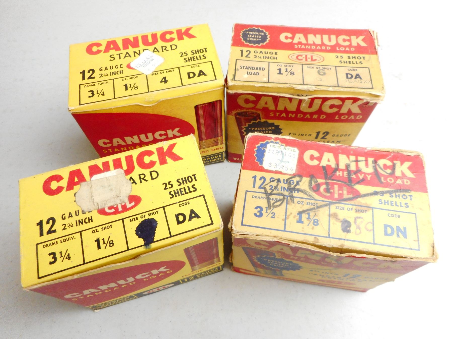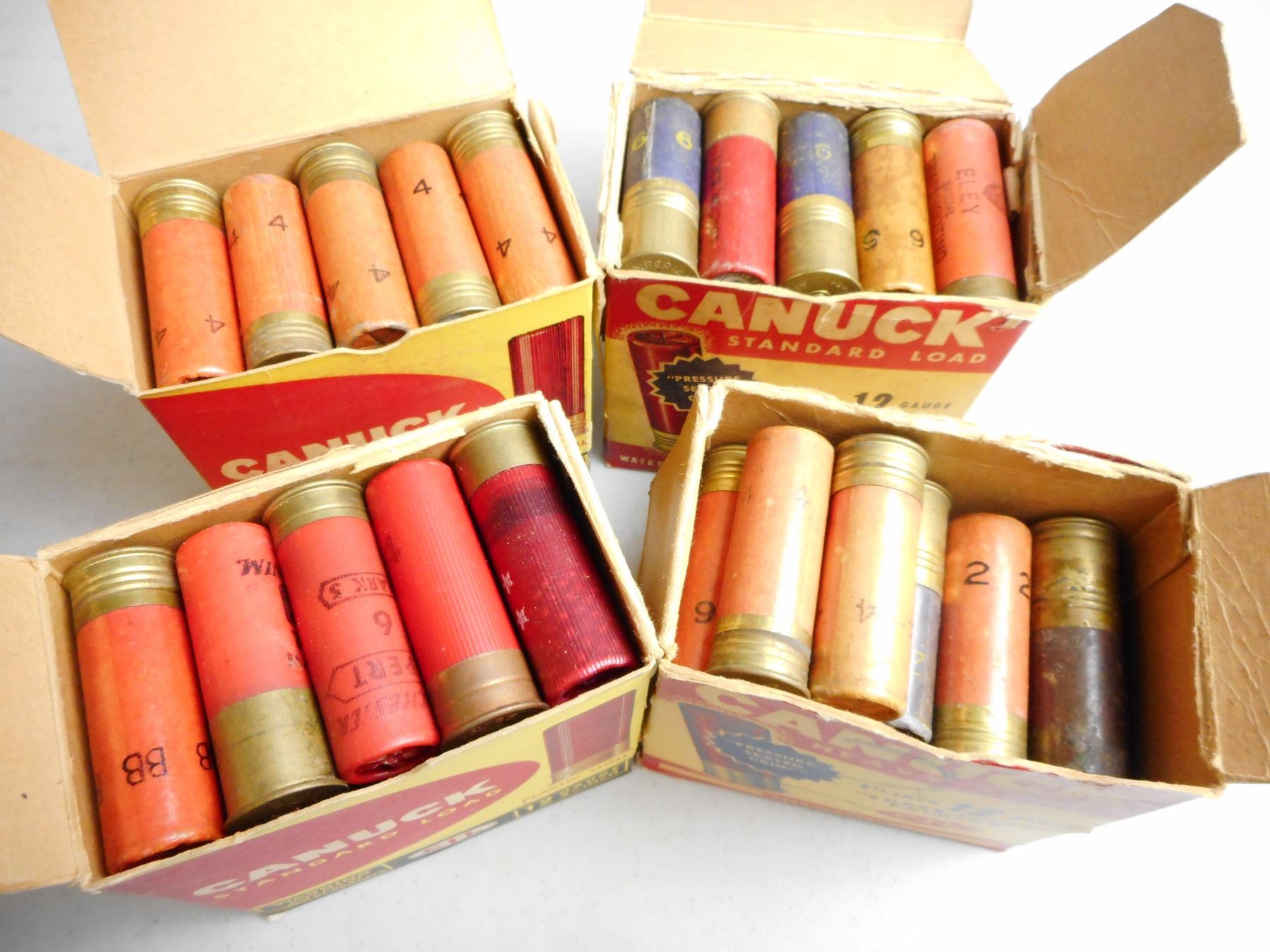 ASSORTED 12 GA 2 3/4" AMMO , 97 RNDS ASSORTED SHOT INCLUDES CANUCK #4 SHOT, ALL IN ANTIQUE CANUCK BOXES