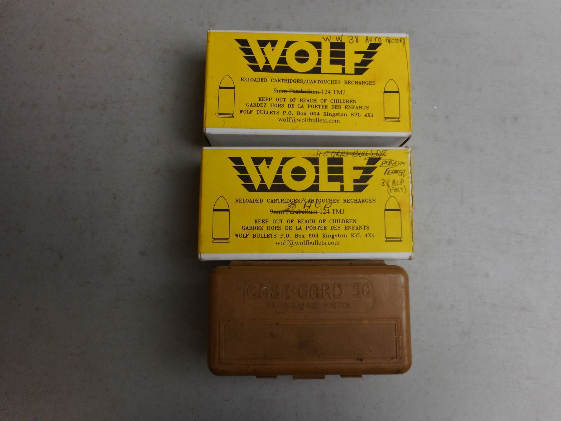ASSORTED 38 CAL AMMO/RELOADS , 150 RNDS INCLUDES 38 SPL, 38 ACP & AUTO, WITH PLASTIC AMMO CASE