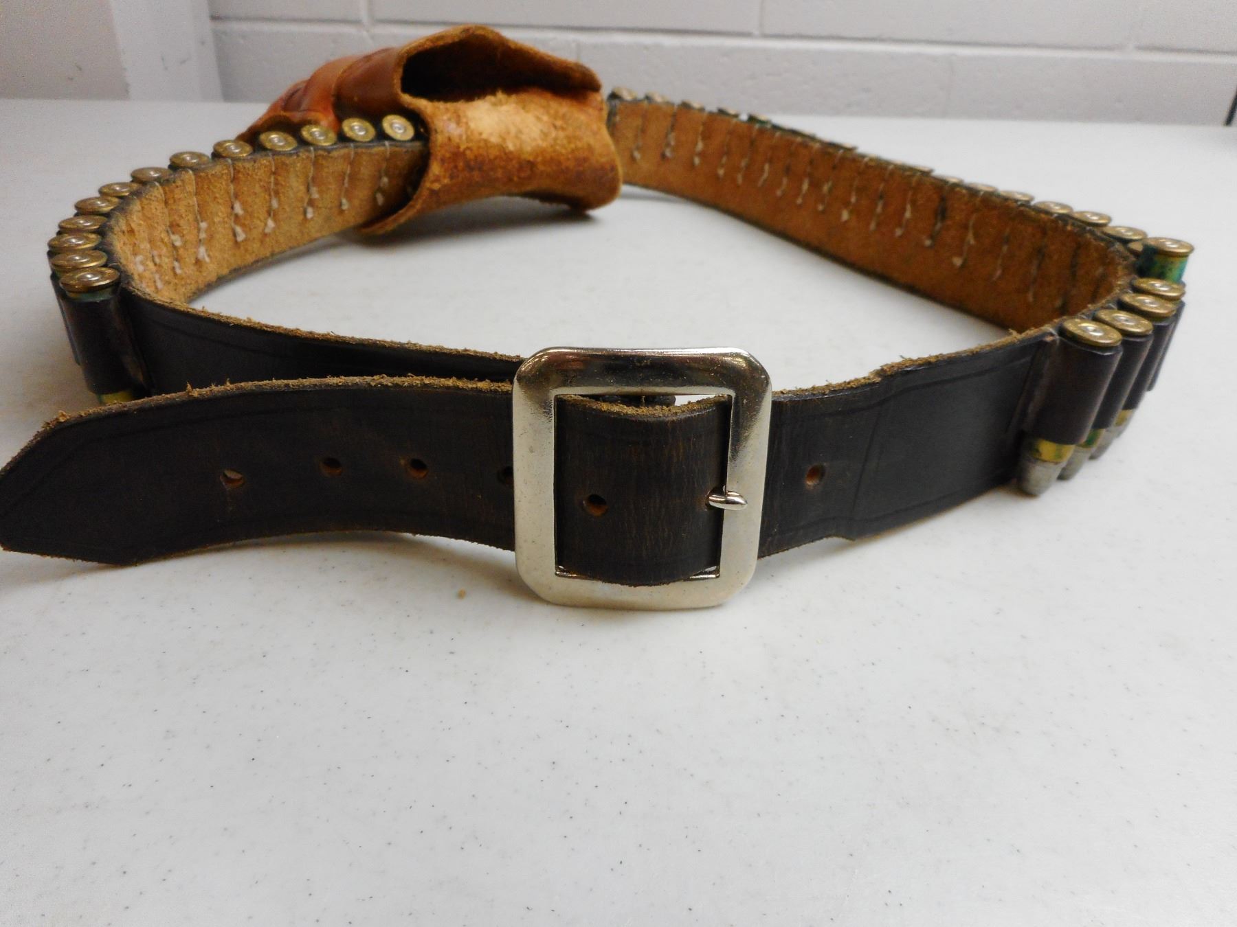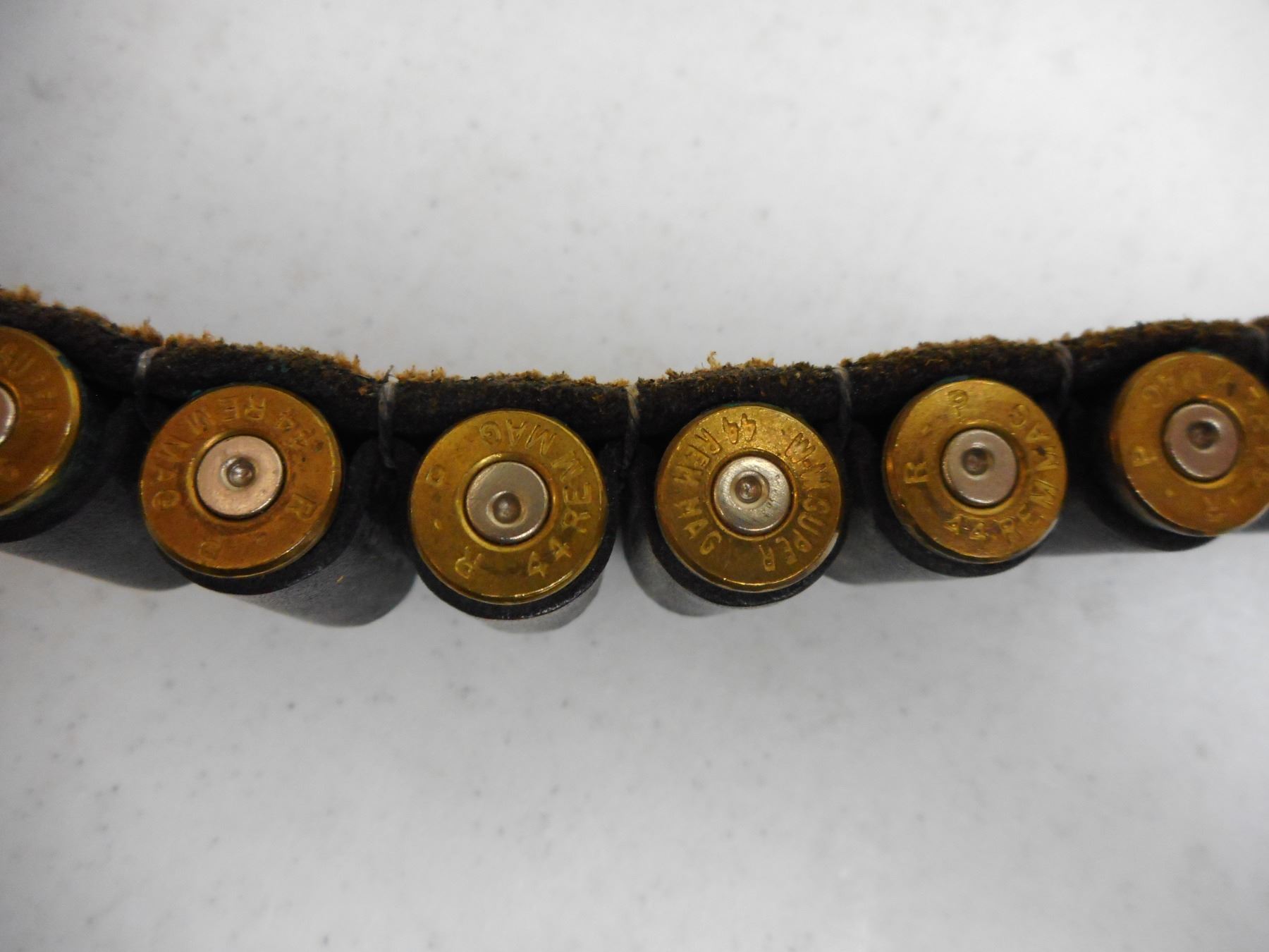 WESTERN STYLE HOLSTER & AMMO BELT WITH AMMO , 44 RNDS WITH SPENT PRIMERS, 44 REM MAG, APPROX 38" BELT SIZE