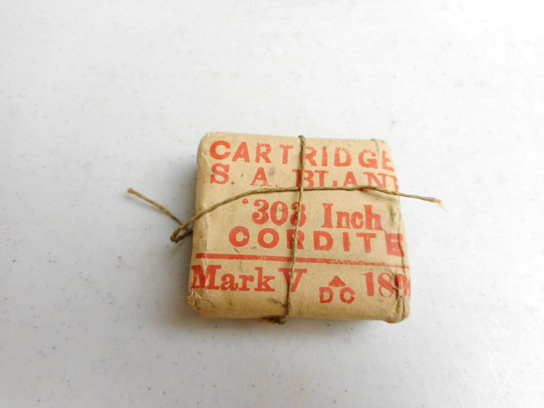 CARTRIDGE S.A. BLANK 303 INCH CORDITE AMMO , MARK V DATED 1899 WRAPED BUT STRING HAS BROKE