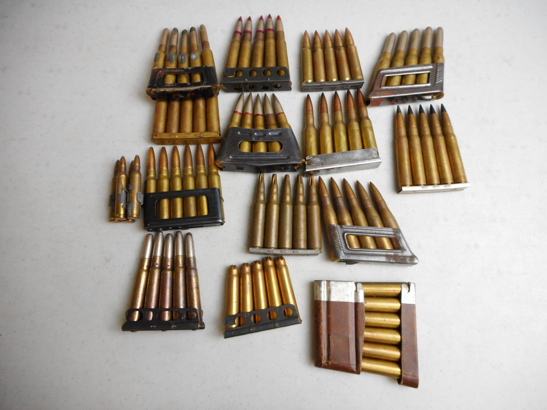 ASSORTED COLLECTORS MILITARY AMMO , 76 RNDS INCLUDES ON STRIPPER CLIPS INCLUDES 303 BRITISH, CARBINE CLIPS, 7.62, HEADSTAMPS INCLUDES WWII ERA DATES
