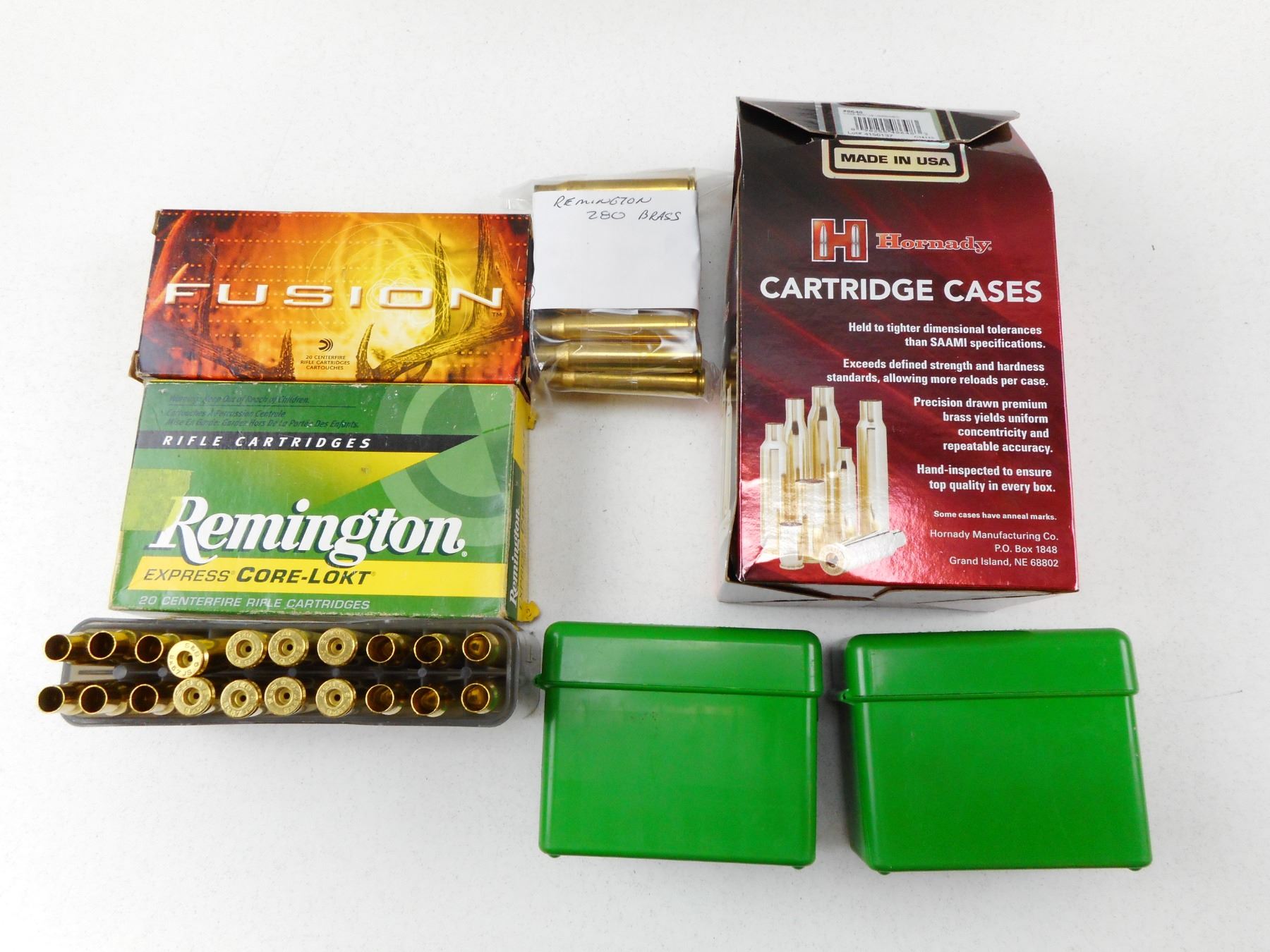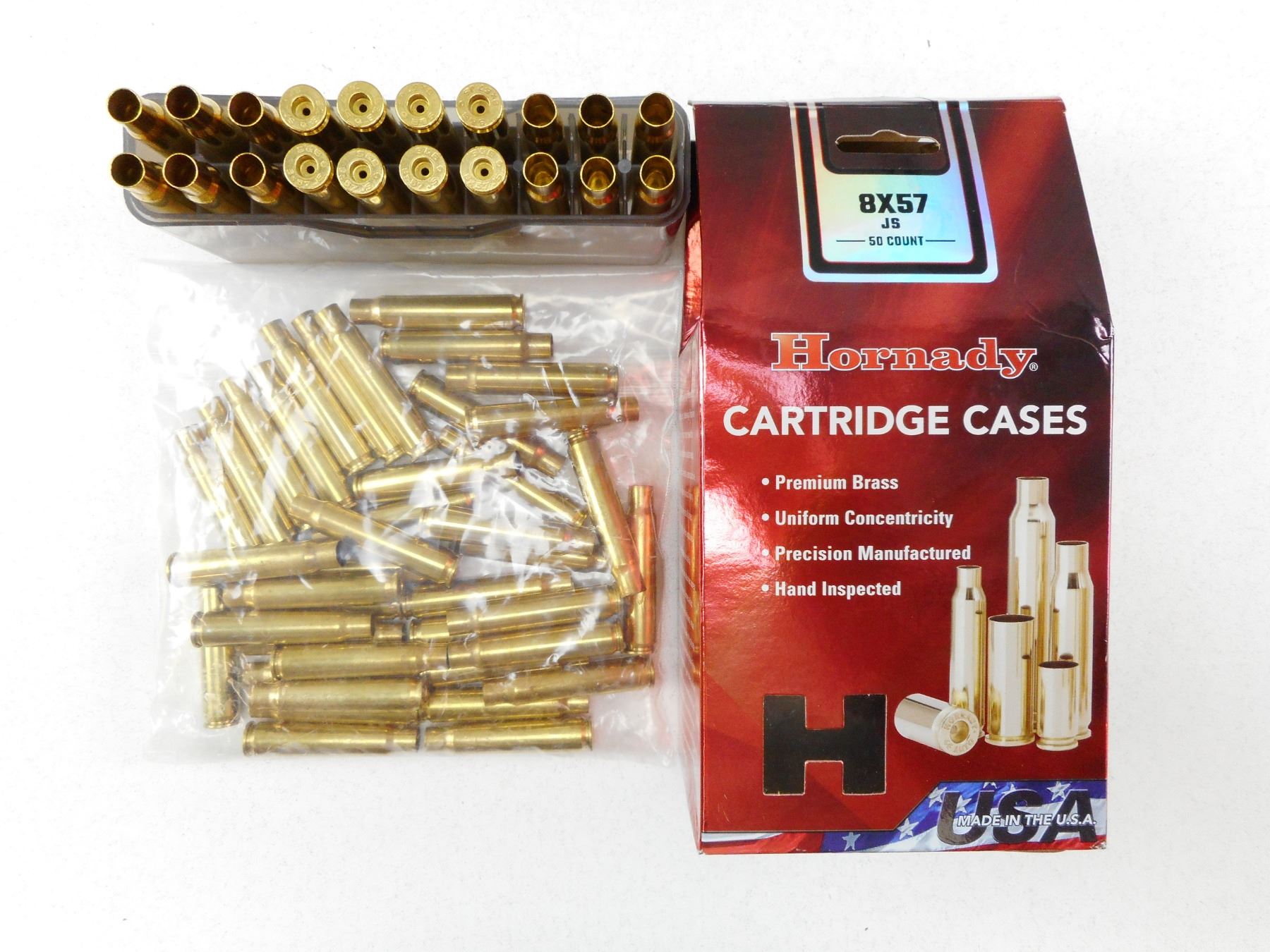 ASSORTED 8X57 & 280 REM BRASS , 130 BRASS INCLUDES NEW HORNADY 8 X 57 JS, USED 30-30 WIN & 280 REM, (3) PLASTIC AMMO CASES